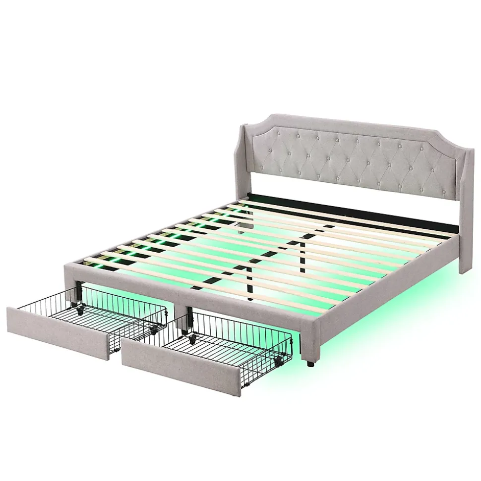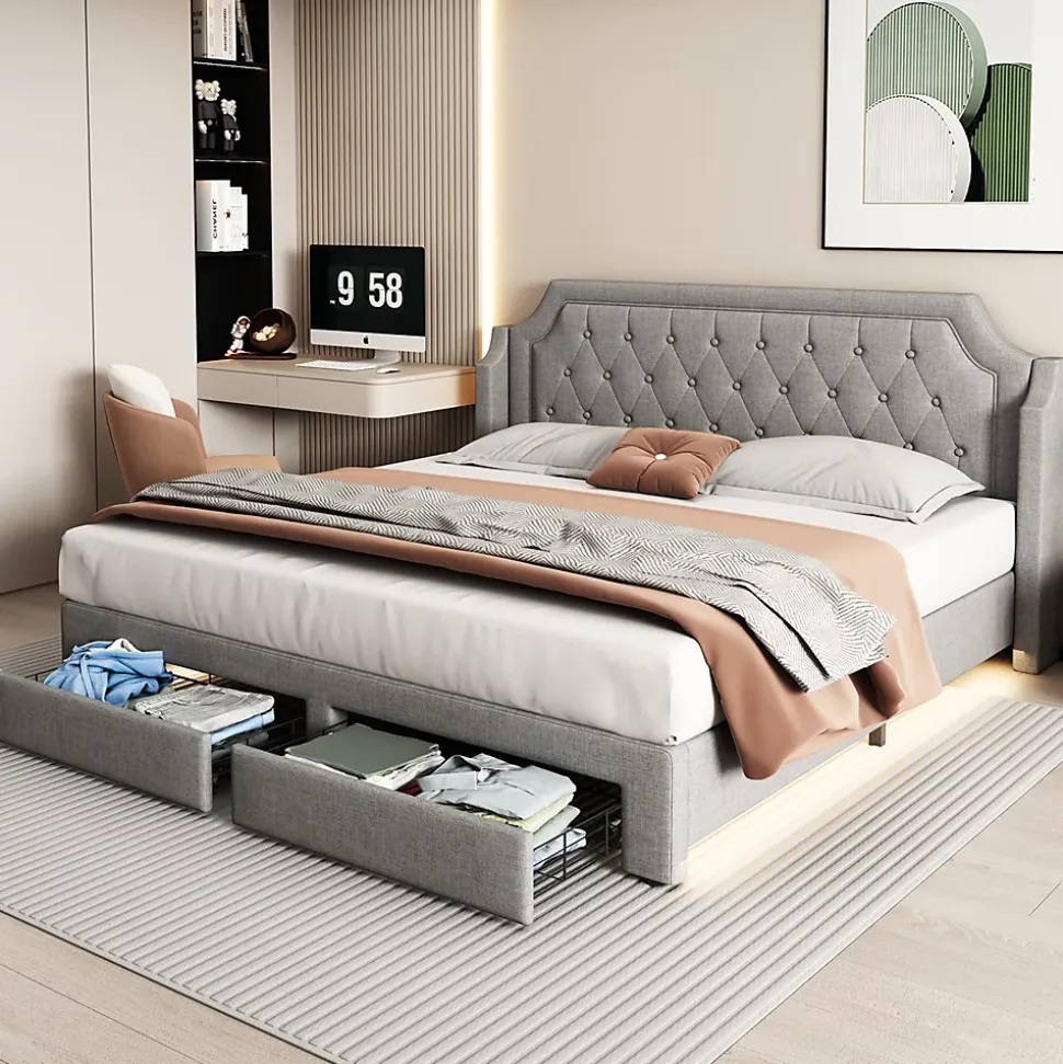 Dimensions totales :207x181x99cm(LxLxH)Capacité de charge :300 kgCouleur :grisMatériau du plateau :linNombre de paquets : 2Montage nécessaire : OuiType de matelas :sans matelasDesign intemporel : Le lit capitonné a un design classique mais moderne grâce à son aspect capitonné ; le lit s’adapte à la plupart des styles d’intérieur ; le lit donne un aspect ouvert et spacieux même aux petites pièces.Structure robuste : Le cadre du lit capitonné est stable, facile à assembler et la surface de couchage du lit est de 180*200 cm. Les lattes en bois minimisent le bruit pendant votre sommeil et prolongent la durée de vie de votre matelas. Le sommier à lattes avec latte centrale stabilisatrice rend le lit extrêmement robuste.Matériau de haute qualité : Le lit est fabriqué en lin. Le lin a une forte capacité d’absorption et de dissipation de l’humidité et a également un bon effet d’inhibition des bactéries et des champignons, ce qui peut prévenir efficacement certaines maladies.Éclairage LED : L’éclairage LED sur le côté du lit fournit une lumière confortable et vous pouvez facilement régler la luminosité et la couleur à l’aide de la télécommande.Espace de rangement suffisant : Les 2 tiroirs sur roulettes offrent un espace de rangement pour les oreillers, les couvertures, etc. Les tiroirs sont faciles à tirer des deux côtés grâce aux roulettes situées sous le lit double.Dossier confortable : La tête de lit, doucement rembourrée, est confortable et invite à s’attarder. La tête de lit haute à rembourrage épais est parfaite pour s’y adosser en lisant ou en regardant la télévision.Soutien optimal : Le lit est doté d’un cadre à lattes en bois robuste pour un sommeil reposant et sain. Les pieds hauts et stables offrent un soutien encore meilleur et une bonne circulation de l’air sous le lit.