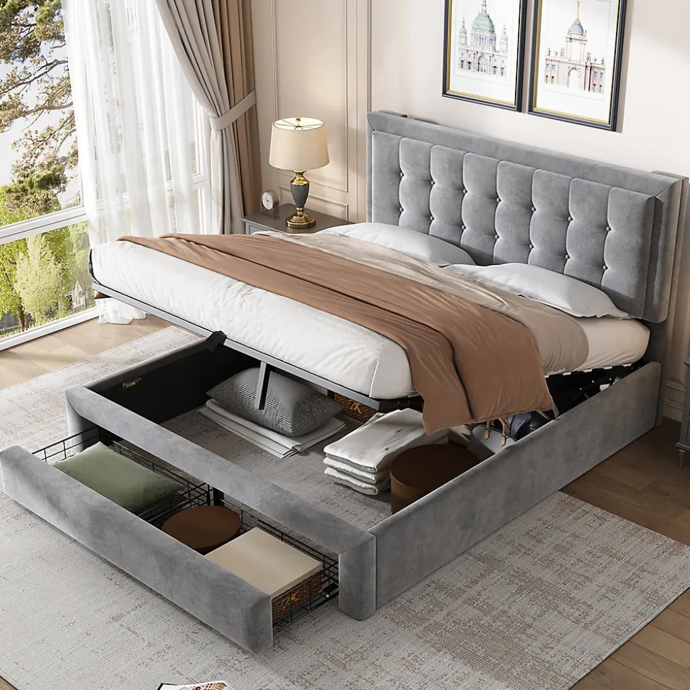 Dimensions totales :200x145x91-101cm(LxLxH)Capacité de charge :300kgCouleur :grisPoids net :49 kgMatériau du plateau :VeloursHauteur du pied de lit :33cmSurface de couchage :140x200cmNombre de paquets:2Type de matelas :sans matelasMontage nécessaire : OuiAspect élégant :Le lit est de style européen simple, il respire l’élégance pure, apporte une couleur élégante à votre chambre et convient parfaitement à la décoration intérieure.Tête de lit réglable en hauteur :La tête de lit peut être réglée de 10 cm vers le haut ou vers le bas, ce qui permet de répondre aux besoins des différentes morphologies. La tête de lit est douce et confortable, ce qui permet de soutenir confortablement votre corps lorsque vous vous appuyez sur la tête de lit.Fonction de rangement puissante :Le lit est doté d’une fonction de rangement puissante, combinée à des barres hydrauliques et à des tiroirs en treillis métallique. Facile à nettoyer au quotidien, il offre un espace de rangement pour vos affaires et permet de garder votre chambre propre et confortable.Support robuste à trois pieds :Le cadre de lit est soutenu par trois pieds en métal, et l’espacement scientifique des pieds de soutien rend votre lit plus ferme et plus stable pendant l’utilisation.Composition simple :Le design du lit est simple et élégant, et il est facile à assembler selon les instructions, ce qui vous permet de gagner un temps précieux. Si vous rencontrez des problèmes pendant le processus d’assemblage, veuillez nous contacter à temps.Remarques :En raison des mesures manuelles, une erreur de 2 à 3 cm peut se produire.Ce produit sera divisé en deux colis pour la livraison. Il se peut qu’ils n’arrivent pas en même temps. Veuillez patienter.