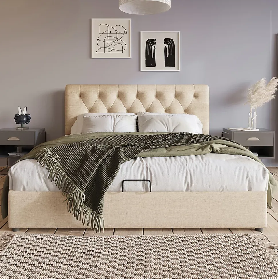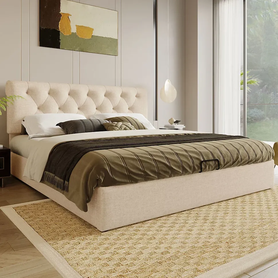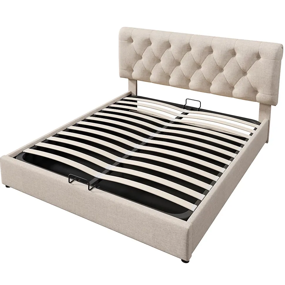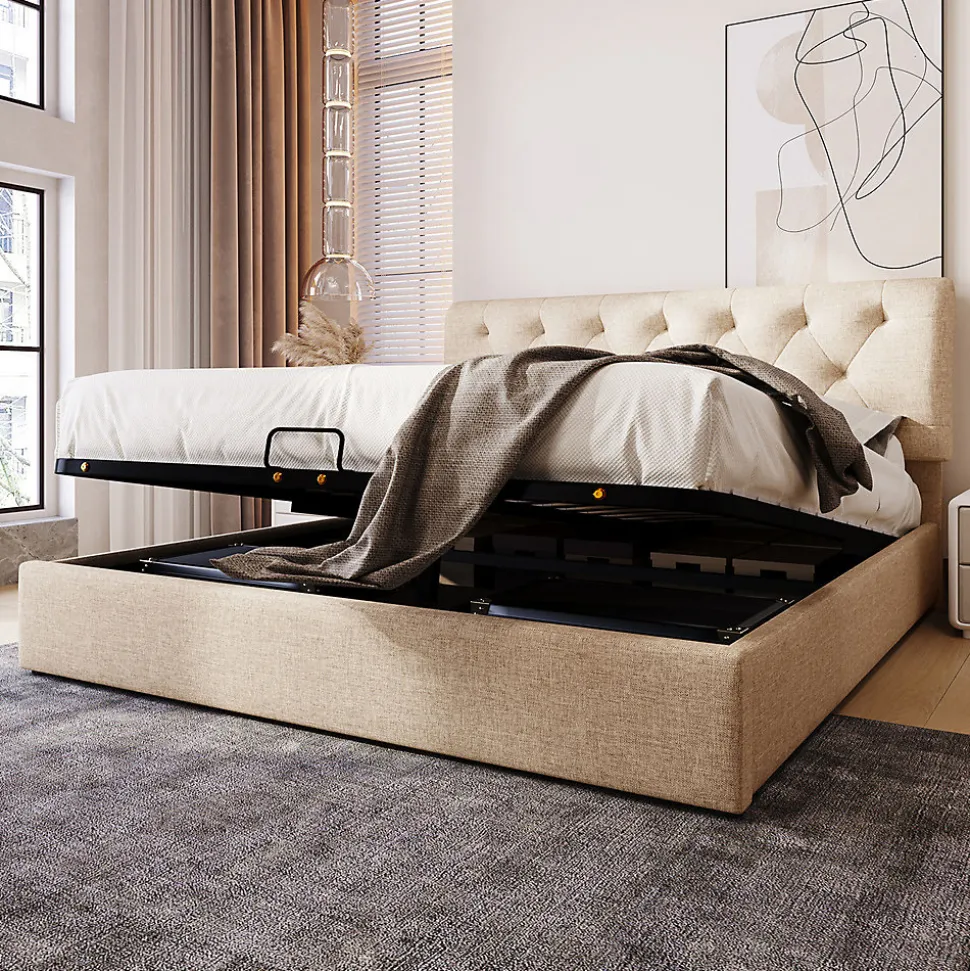 Couleur : NaturelDimensions hors tout : 212 x 148 x 106-112 cm (L x l x H)Espace de rangement interne : 195 x 24 x 136 (l x H x P)Tête de lit réglable : 106-112 cmMatériau des panneaux : bois massif + lin + métalPoids maximal de l’utilisateur : 220 kg/485 lbsDistance de la tête de lit : 22-28 cmSommier requis : nonAssemblage requis : ouiContenu du colis : cadre de litMatelas compatible (matelas non inclus) : 140 x 200 cmNombre de colis : 2Tête de lit réglable en hauteur : La hauteur de la tête de lit est réglable, avec une différence d’environ 6 cm. Les personnes de tailles différentes peuvent trouver le meilleur confort en réglant la hauteur de la tête de lit. L’épaisseur du matelas applicable est d’environ 22-28 cm.Barre hydraulique – grand espace de rangement : Grand sommier sous le cadre à lattes repliable avec beaucoup d’espace de rangement pour les couvertures, les oreillers ou le linge de lit, le cadre à lattes peut être facilement replié par le vérin de levage.Construction solide :Les lattes du lit sont faites de lattes élastiques de haute qualité en bois de pin, ce qui permet d’obtenir un confort de couchage unique et les lattes élastiques peuvent mieux prolonger l’utilisation du matelas.Pour empêcher le matelas de glisser, l’avant et l’arrière du cadre de lit sont également équipés de languettes de traction en fer.Tissu doux pour la peau :Le tissu confortable et la tête de lit réglable vous permettent de vous asseoir et de lire ou de regarder la télévision tous les soirs.Informations détaillées Disponible en deux tailles : 140×200 cm/160×200 cm.Pour réduire le risque de dommages, ce cadre de lit est expédié dans deux cartons qui peuvent arriver à des jours différents. Si les deux colis sont arrivés mais qu’il manque des pièces, veuillez contacter le service clientèle.