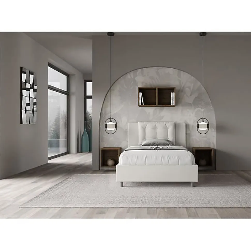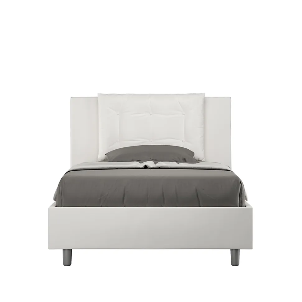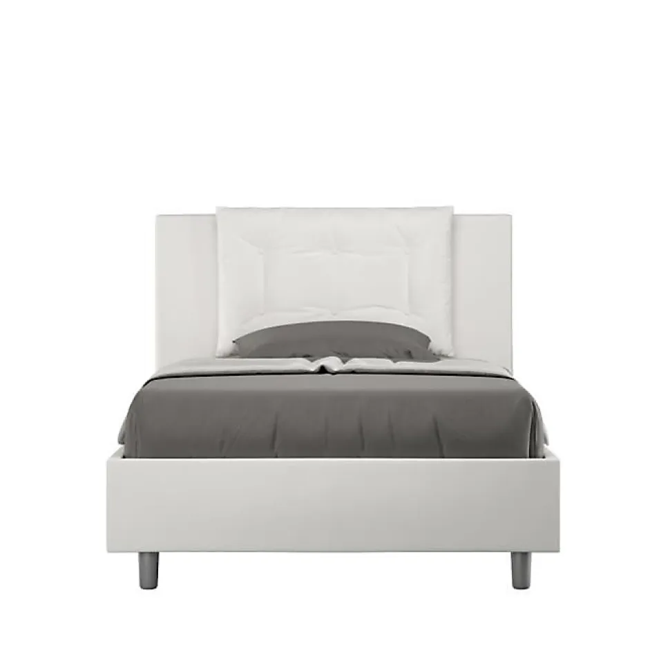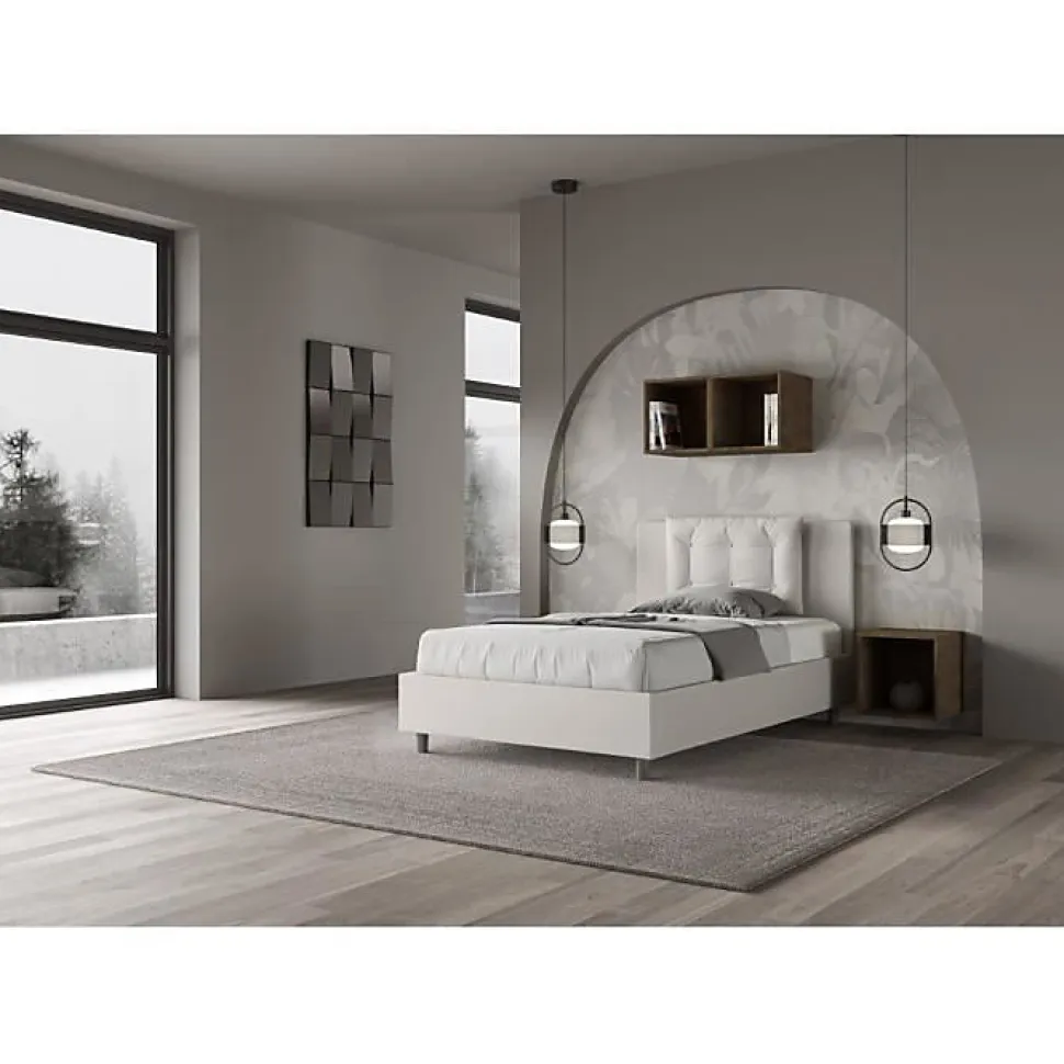 Lit queen size Annalisa 120×210 avec tête de lit et lit rembourrés, revêtement en simili cuir, particulièrement polyvalent et facilement combinable avec n’importe quel style d’ameublement.Le lit queen size Annalisa 120×210 se caractérise par un style élégant et raffiné grâce aux larges coussins de la tête de lit, il est entièrement recouvert de simili cuir.La présence du matériau en simili cuir, en plus de donner à la pièce une atmosphère accueillante et invitante, offre la commodité d’un nettoyage rapide et facile, grâce à l’utilisation d’un simple chiffon en microfibre.Lit fourni avec sommier à lattes, prévu pour un matelas 120×210 cm – Matelas non inclusCouvre-lit non amovible.Produit ItyhomeFabriqué en ItalieDimensions lit : L.135 P.222 H.110 cmHauteur des pieds : 12 cmHauteur du lit : 27 cmHauteur du filet depuis le sol : 39 cm