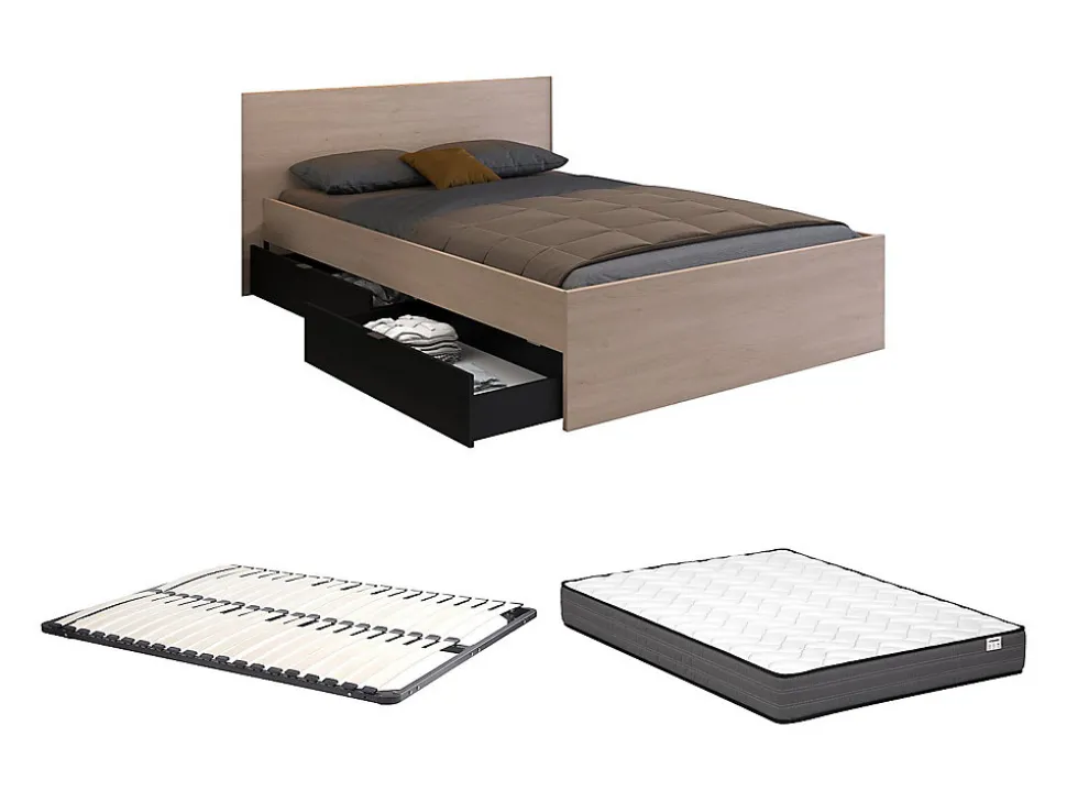 Laissez-vous tenter par le charme naturel des produits VELONA qui apporteront une touche de modernité à votre chambre. Ses nombreux rangements vous permettront de gagner de la place dans votre pièce.1 x Cadre de lit VELONA n°1Caractéristiques Couleur (nuance) : Naturel clair Matière (précision) : Panneau de particule Finition : Mélaminé Taille (couchage) : 160 x 200 cm Nombre de places : 2 places Gamme : Good for Planet, Création Exclusive Produit : Fabriqué en France À monter soi-mêmeDimensions Longueur : 164.4 cm Hauteur : 82.6 cm Profondeur : 243 cm Hauteur de couchage : 39.7 cm2 x Cadre de lit VELONA n°2Caractéristiques Couleur (nuance) : Noir Matière (précision) : Panneau de particule Finition : Mélaminé Taille (couchage) : 160 x 200 cm Nombre de places : 2 places Type de rangement : 2 tiroirs Tiroir coulissant Gamme : Good for Planet, Création Exclusive Produit : Fabriqué en France À monter soi-mêmeDimensions Longueur : 189.6 cm Hauteur : 19.6 cm Profondeur : 50.8 cm1 x Matelas classique AMBRACIECaractéristiques Technologie (âme) : Ressorts ensachés Nombre de ressorts (matelas) : 580 Soutien : Equilibré Technologie matelas (accueil) : Mousse de confort Densité (accueil) : 23 kg/m³ Accueil : Tonique Garnissage du matelas : Fibres de polyester Coutil (matière) : Coutil stretch Couleur (nuance) : Blanc Matière (précision) : 100 % Polyester Taille (couchage) : 160 x 200 cm Nombre de places : 2 places Indépendance de couchage : Indépendance de couchage Réversible été/hiver, Carénage Gamme : Good for Planet Garantie : 5 ans Produit : Fabriqué en Europe Compressé/roulé : Compressé/rouléDimensions Longueur : 200 cm Hauteur : 20 cm Profondeur : 160 cm Epaisseur matelas : 20 cm Hauteur de l’âme : 15 cm1 x Cadre à lattes KALISTACaractéristiques Couleur (nuance) : Noir Matière (précision) : Métal Epaisseur métal : 1.2 mm Taille (couchage) : 160 x 200 cm Nombre de places : 2 places Sans pieds Technologie (sommier) : Lattes