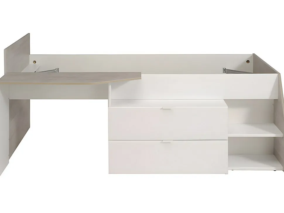 En un seul lit, profitez de toutes sortes de rangements : un bureau, un espace bibliothèque, 2 tiroirs façon commode, un espace de rangement sous le lit. Ses coloris sobres et tendances en font un lit mixte. De plus, ses découpes apportent encore plus de style à ce lit toutes fonctions. A savoir : ce lit est compatible avec tous les sommiers et matelas 90 x 190 cm et 90 x 200 cm mais nous vous proposons ici un sommier et un matelas de la taille la plus grande et non modulable, c’est-à-dire 90 x 200 cm.1 x Lit combiné GISELECaractéristiques Couleur (nuance) : Blanc, Naturel clair Matière (précision) : Panneau de particule Finition : Mélaminé Taille (couchage) : 90 x 190 cm, 90 x 200 cm Nombre de places : 1 place Avec bureau Type de rangement : 2 tiroirs Tiroir coulissant Gamme : Good for Planet Produit : Fabriqué en France À monter soi-même : 1 volume de rangement sous le lit : 2 tiroirs sur coulisses à galets Finition : Mélaminée : Le lit est compatible avec tous les matelas et sommier 90x200cmDimensions Longueur : 203 cm Hauteur : 90 cm Profondeur : 135 cm Bureau : L100 x P39 cm Tiroirs : L75 x P35 cm1 x Matelas classique DANAECaractéristiques Technologie (âme) : Mousse Soutien : Ferme Densité (âme) : 20 kg/m³ Technologie matelas (accueil) : Mousse de confort Densité (accueil) : 20 kg/m³ Accueil : Tonique Garnissage du matelas : Fibres de polyester Densité (garnissage) : 120 g/m2 Coutil (matière) : Polyester Couleur (nuance) : Blanc Matière (précision) : 100 % Polyester Taille (couchage) : 90 x 200 cm Nombre de places : 1 place Réversible été/hiver Gamme : Good for Planet Garantie : 5 ans Produit : Fabriqué en Europe Compressé/roulé : Compressé/rouléDimensions Longueur : 200 cm Hauteur : 15 cm Profondeur : 90 cm Epaisseur matelas : 15 cm Hauteur de l’âme : 12 cm1 x Cadre à lattes KALISTACaractéristiques Couleur (nuance) : Noir Matière (précision) : Métal Epaisseur métal : 1.2 mm Taille (couchage) : 90 x 200 cm Nombre de