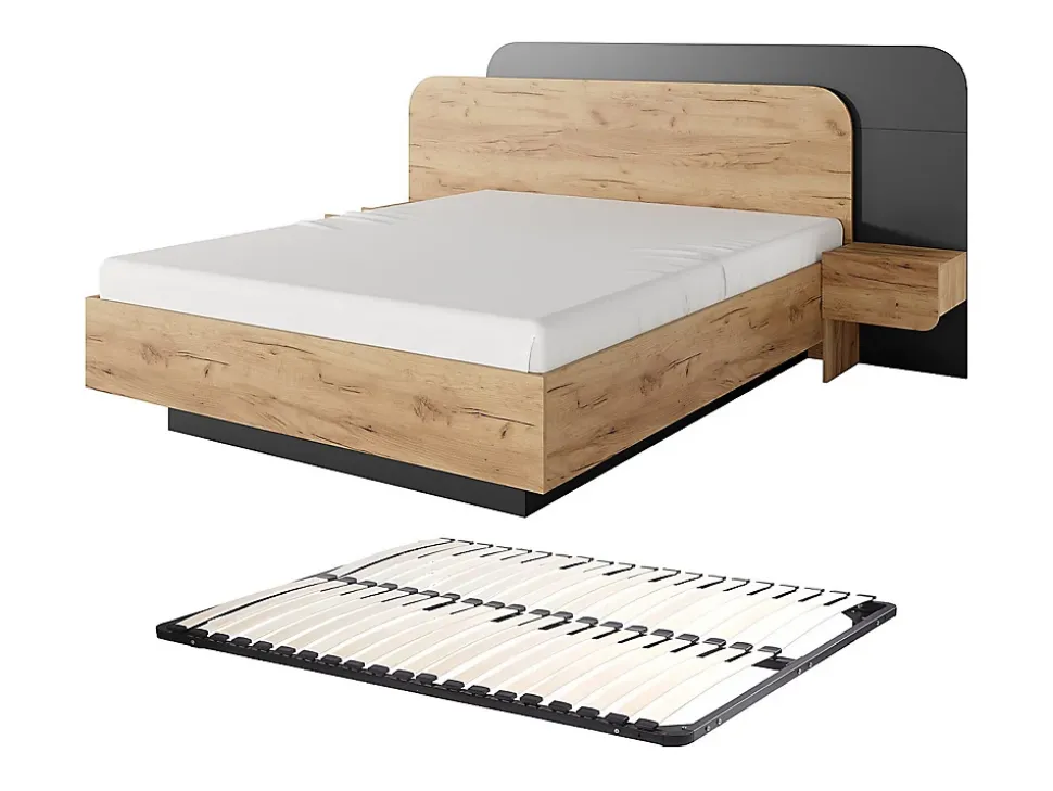 - Lit avec chevets 160 x 200 cm – 2 tiroirs et LEDs – Structure : Panneaux de particules – Coloris : Naturel et anthracite – Style : Moderne – Dimensions : L245,5 x P208,8 x H115,6 cm + Sommier – Optez pour un lit pratique et déco avec DESADO !