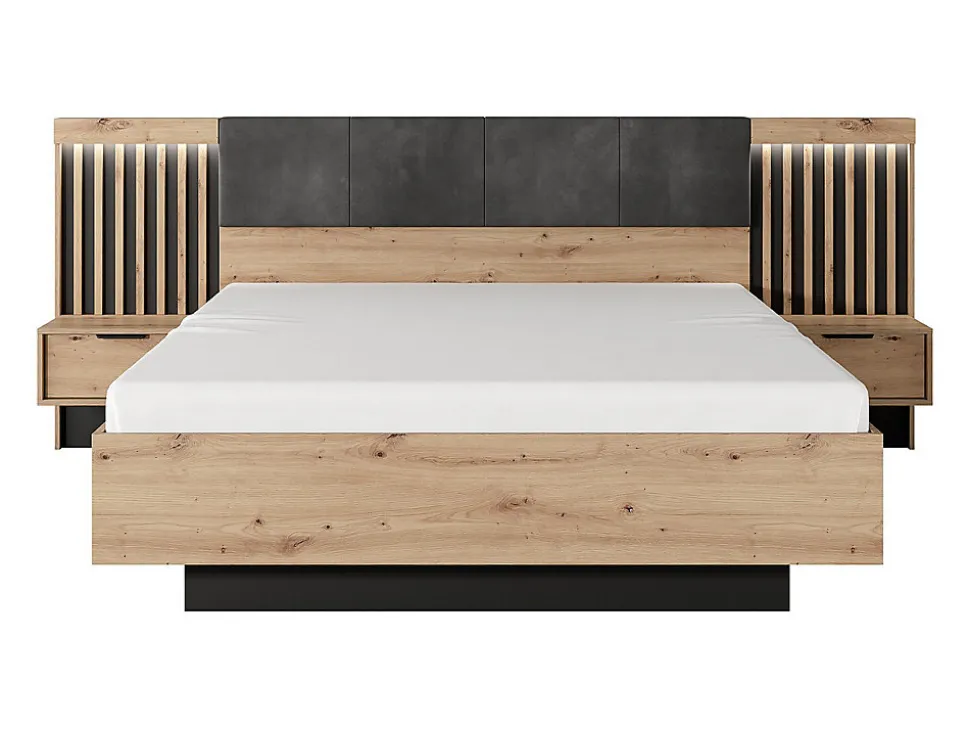 - Lit avec chevets 160 x 200 cm – Avec LEDs – Structure : Panneaux de particules et MDF – Coloris : Naturel et noir – Style : Industriel – Dimensions : L264 x P210 x H104 cm – Apportez du style à votre chambre grâce à la collection ARIADA !