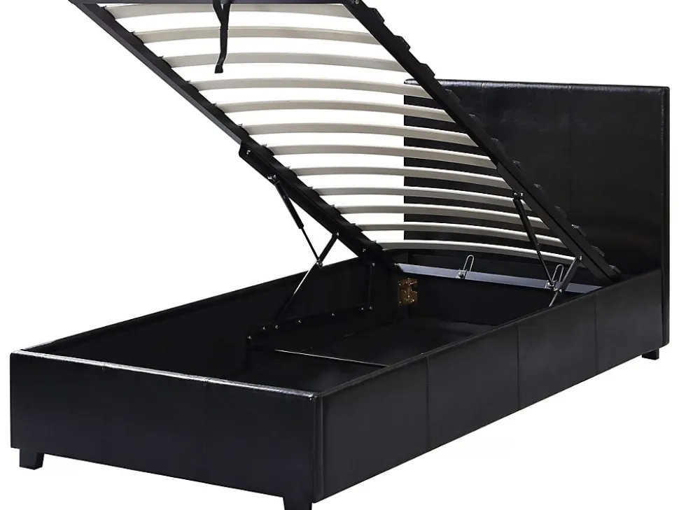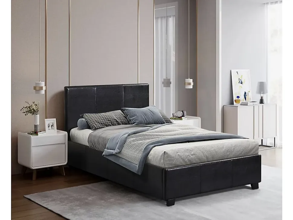 Lit « Carla »Offrez-vous un moment de détente avec ce lit simple ! Idéal pour tous les univers de décoration, il ira à ravir avec votre chambre. Ajoutez un matelas de notre gamme et passez un instant privilégié dans votre petit chez vous. C’est cadeau !Un coffre de rangement intégré vous permettra en plus de dissimuler toutes vos affaires !Existe en plusieurs dimensions. Existe en plusieurs coloris. Lit PVC « Carla » noir – 1 personne – Dimensions lit : 203 x 97 x 86 cm- Dimensions matelas : 90 x 190 cm – Structure en contre plaqué – Pieds en bois – Recouvert de PVC – Sommier à lattes et tête de lit inclus – Coffre de rangement en toile inclus .Descriptif: Apportez un changement à votre quotidien avec notre lit Carla – Sommier à lattes et tête de lit inclus – Matelas vendu séparément – Fond du coffre en toileMatière(Filtre): Simili cuirMatières: Simili cuirCouleurs: noircouleur (filtre): NoirDimensions: 203 x 97 x 86 cmDimensions du couchage: 90×190 cmDimensions (Filtre): 90 x 190 cmTiroirs: Coffre de rangement inclus Dimensions : 192 x 92 x 16 cmCoffres: Fond du coffre en toilepieds: 6,5 x 3,5 x 4,5 cm – BoisPoids: 38.5 kgColisage: 2 colis : – 0,995 x 0,995 x 0,07 m, 11,5 kg – 2 x 0,275 x 0,155 m, 27 kg