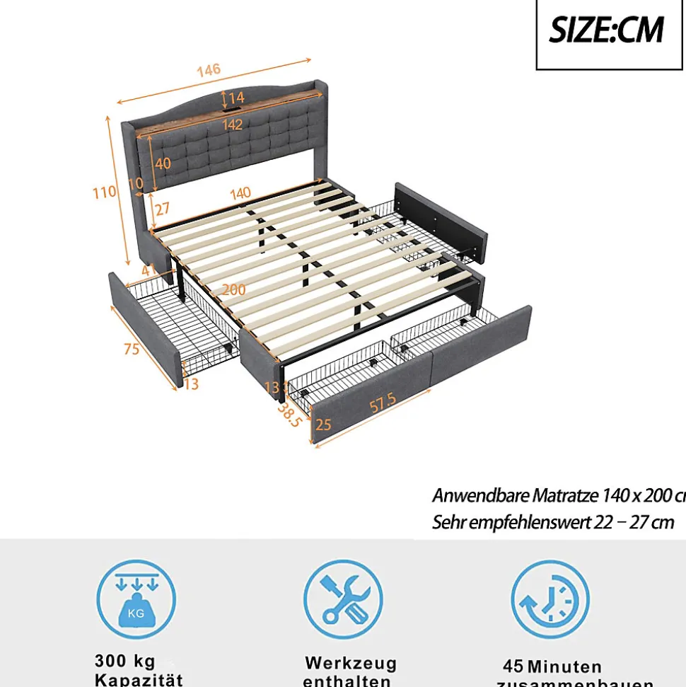 - 【Lit Multifonction avec USB】 Ce lit rembourré intègre un port USB et une tablette au niveau de la tête, vous permettant de charger vos appareils et de garder vos objets essentiels à portée de main pour plus de praticité et confort.