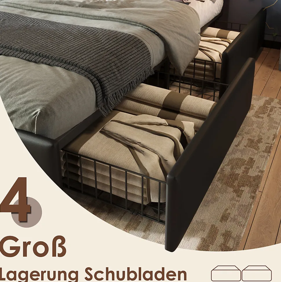 ▶ ▶ Détails ▶────────────────● Nom du produit : Lit double● Dimensions totales : 167.5 x 207 x 92-102 CM● Matériau : PU● Couleur : Noir● Charge maximale : 300 KG● Hauteur du dossier : 17-27 CM● Montage requis : Oui● Contenu du paquet : Bettgestell+LED+Schubladen● Matelas compatible (non inclus) : 160 x 200 CM● Nombre de colis : 2● Dimensions intérieures des tiroirs : 70 x 43 x 14.5 CM● Poids brut/net : 56.94 / 51.3 KG► Remarques ►※ Ce produit est livré en 2 colis. Ils peuvent ne pas arriver en même temps. Veuillez patienter.※ En raison de mesures manuelles, une erreur de 2-3 cm peut survenir.※ Toutes les images de produits sont prises avec les produits réels, mais en raison de la lumière du soleil et d’autres facteurs, des différences de couleur peuvent apparaître.※ Si vous avez des questions lors de l’installation, veuillez nous contacter dès que possible.