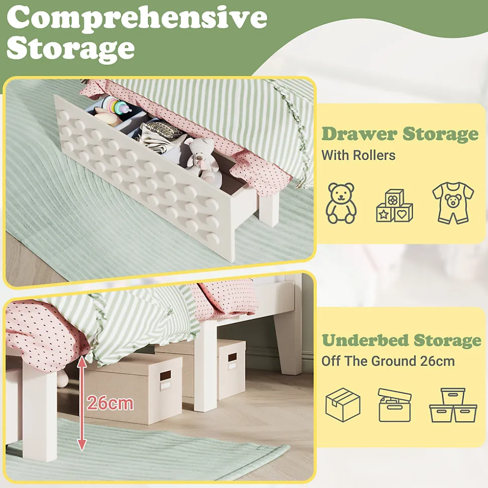 - 【Tiroir à Roulettes Fonctionnel】 Situé au pied du lit, ce tiroir mobile facilite le rangement des jouets, vêtements ou linge de lit, aidant à maintenir la chambre ordonnée tout en simplifiant l’accès aux objets du quotidien.