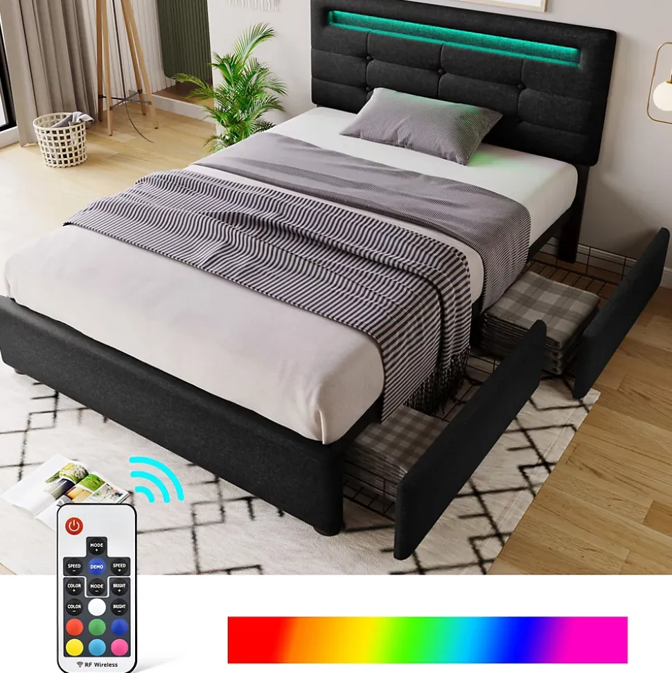 - 【Design élégant et moderne avec éclairage LED】 Ce lit est un mélange parfait de confort et de style. Sa tête de lit, ornementée de boutons décoratifs, ajoute une touche moderne, tandis que l’éclairage LED intégré, contrôlable par télécommande, vous permet d’ajuster la couleur et l’intensité de la lumière pour une ambiance personnalisée.