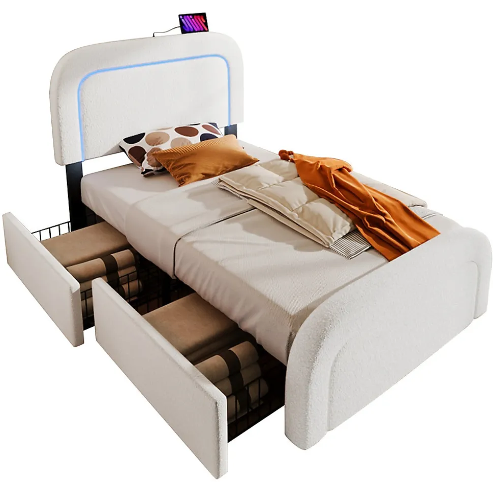 ▶ ▶ Détails ▶────────────────● Nom du produit : Cadre de lit avec fonction de charge USB Type C, éclairage LED et 4 tiroirs● Couleur : Blanc● Matelas applicable (matelas non inclus) : 90 x 200 cm● Dimensions totales : 208 x 100 x 102,5-112,5 cm (L x l x H)● Matériau des panneaux : Sherpa● Poids maximal supporté : 300 LBS (environ 136 kg)● Hauteur du dossier : 25-35 cm● Boxspring requis : Non● Montage nécessaire : Oui● Contenu du colis : Cadre de lit + Fonction de charge USB Type C + Tiroirs● Design unique : Fonction de charge USB Type C● Nombre de colis : 2● Poids brut/net (kg) : 34,7 / 31,5► Remarques ►※ Ce produit sera livré en 2 colis. Ils peuvent ne pas arriver en même temps. Merci de patienter.※ En raison des mesures manuelles, une erreur de 2-3 cm peut se produire.※ En raison de l’éclairage, des différences de couleur peuvent exister entre l’image du produit et le produit réel. Veuillez vous référer au produit que vous recevez réellement.※ Si vous avez des questions pendant l’installation, n’hésitez pas à nous contacter rapidement.