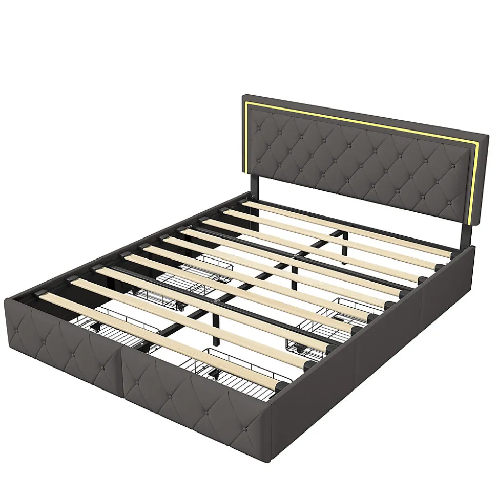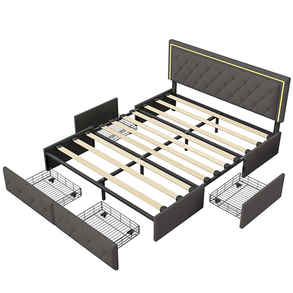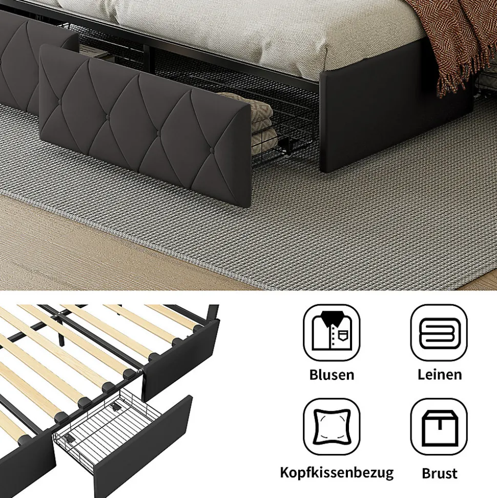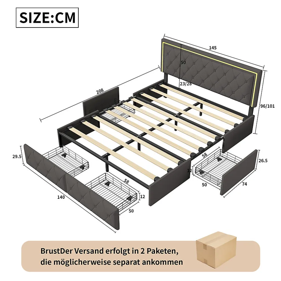 Lit avec rangement: le lit est conçu avec quatre tiroirs spacieux, parfaits pour ranger les vêtements et les draps. C’est la solution parfaite pour optimiser l’espace d’un petit appartement ou d’un studio. La tête de lit avec bande lumineuse LED peut vous fournir un éclairage chaleureux la nuit.Détails de la taille: lit avec rangement est disponible en deux tailles: 140x200cm, 160x200cm, la couleur est également disponible en deux tailles: blanc et gris, s’il vous plaît choisir la bonne taille et la couleur que vous voulez. Veuillez vous référer aux détails de l’image pour des détails spécifiques.Matériaux de haute qualité: lit double avec base en bois massif et lattes métalliques, cuir extérieur et rembourrage intérieur en Mousse éponge pour un soutien solide et un confort de sommeil optimal. Le matériau doux du lit offre non seulement une sensation de confort, mais réduit également efficacement les dommages causés par les coins et les bords tranchants que vous ou votre famille pouvez rencontrer lors de l’utilisation.Construction métallique robuste: la base à lattes supporte 500 kg grâce à un cadre métallique robuste. Lattes métalliques pour répartir uniformément le poids et 4 pieds intermédiaires pour un support central solide pour une stabilité accrue.Installation efficace: afin de réduire les risques de dommages, ce cadre de lit est expédié en 2 cartons et peut arriver à des dates différentes. Ne vous inquiétez pas, les instructions claires et complètes fournies par le colis, toute question s’il vous plaît n’hésitez pas à nous contacter.Couleur:GrisDimensions du produit (L x l x h):208 x 145 x 100 cm; 27 kilogrammesPoids de l’article:27 Kilograms