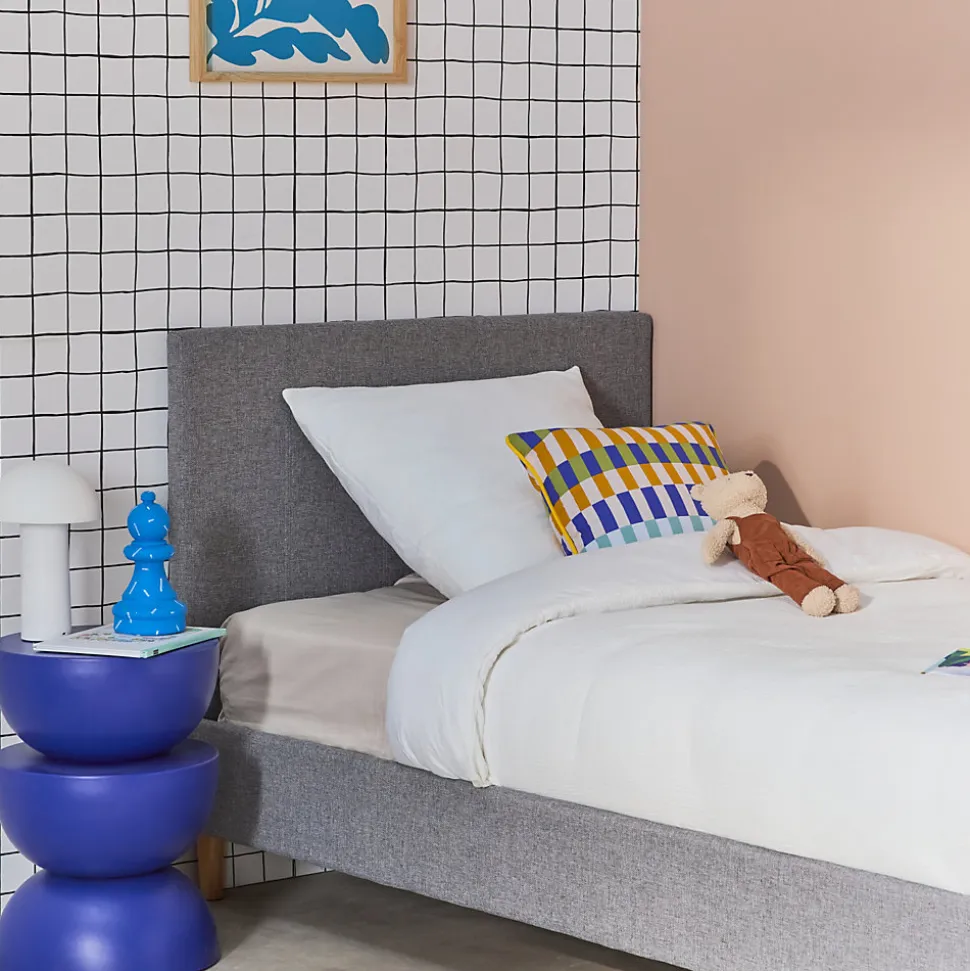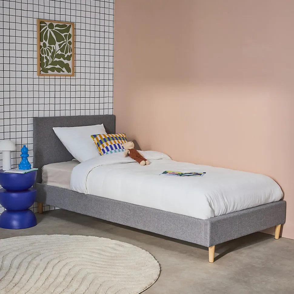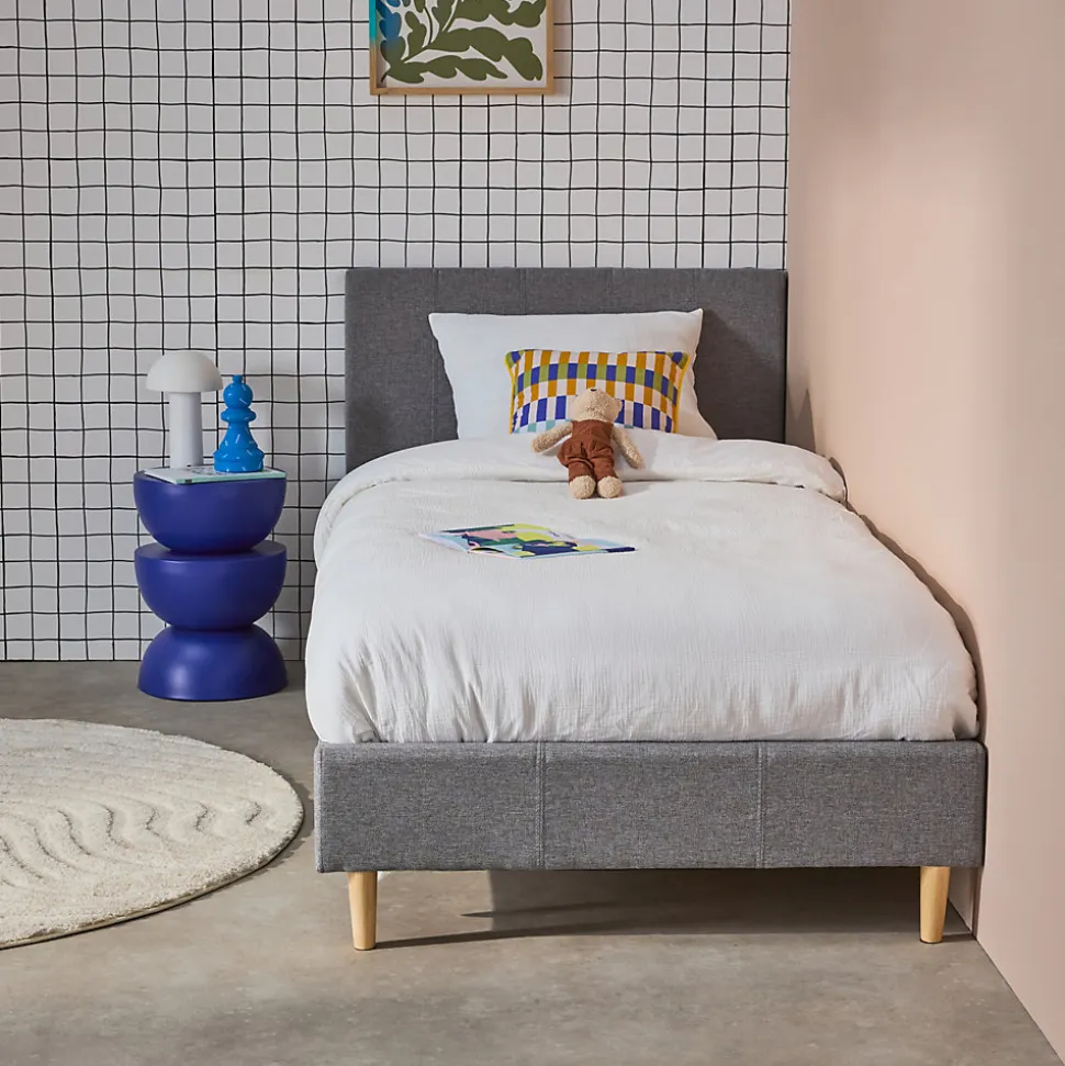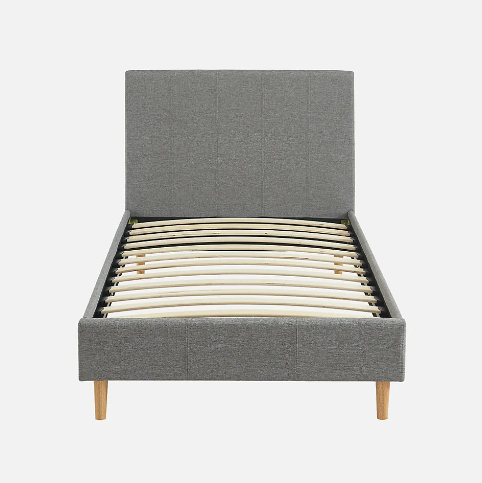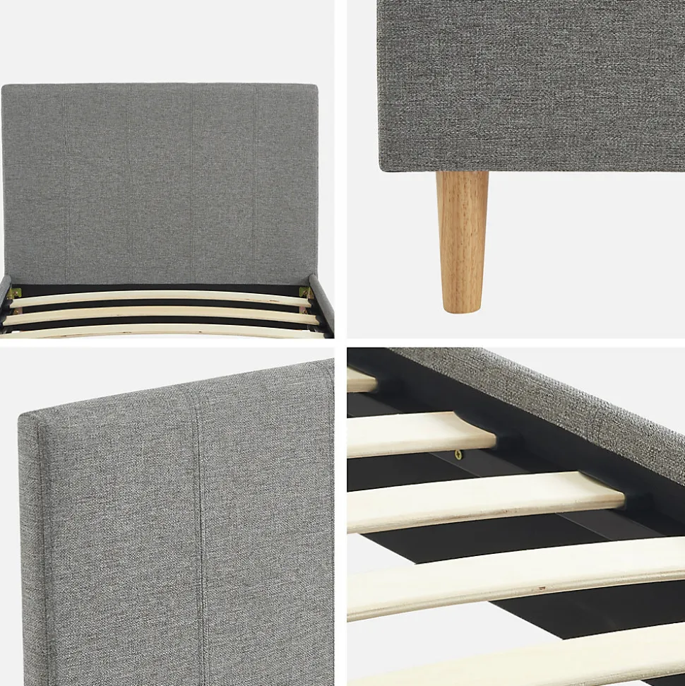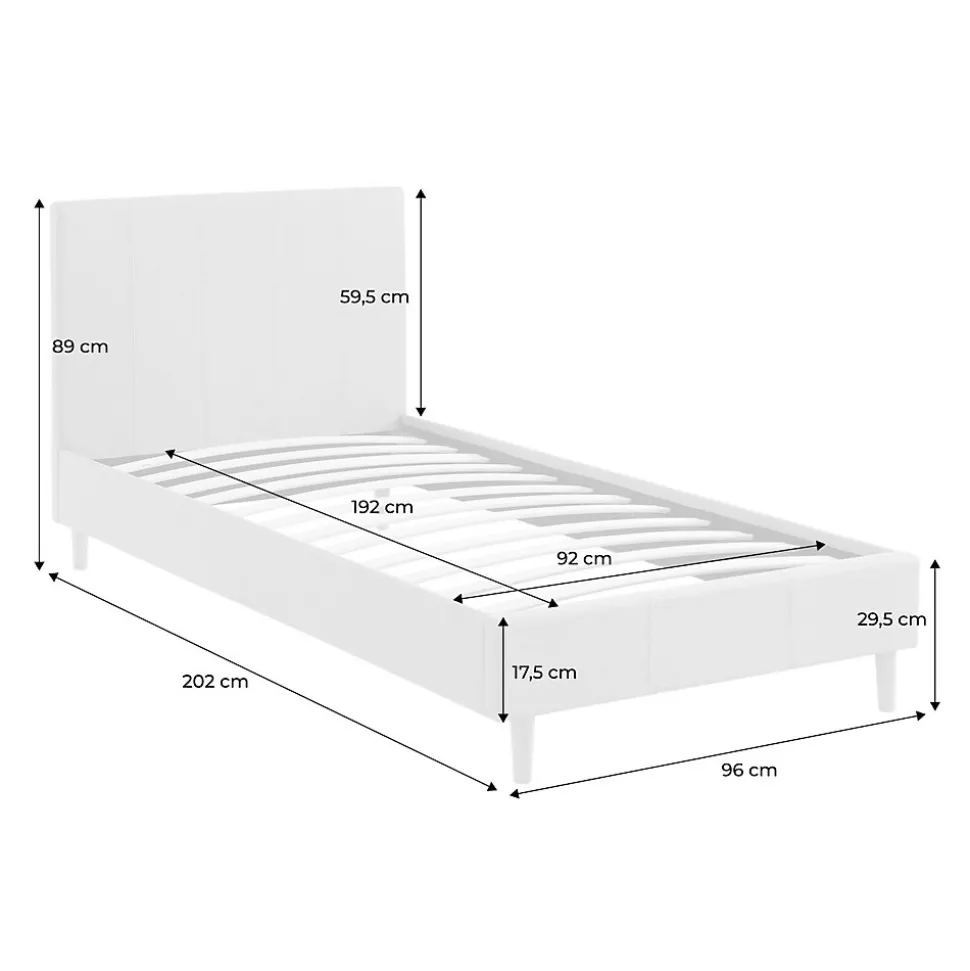 Les + produit :Robuste et durableTête de lit confortableSommier à lattes en bois compositeLes matériaux choisis pour la conception de notre lit Marlon assurent robustesse et longévité.Le bois d’eucalyptus, connu pour sa résistance, est combiné à des panneaux composites qui apportent une stabilité supplémentaire.Le revêtement en polyester est non seulement durable, mais aussi résistant à l’usure. La tête de lit procure un soutien additionnel qui améliore le confort global du lit, la rendant particulièrement agréable.Le lit Marlon s’adapte facilement à différents styles de décoration intérieure, apportant immédiatement une ambiance chaleureuse.Le sommier à lattes en bois composite assure une ventilation optimale du matelas tout en offrant un soutien uniforme. Cela permet de prolonger la durée de vie de votre matelas et à améliorer la qualité de votre sommeil, (et ça, c’est non négligeable !)Les pieds en bois apportent une touche naturelle et esthétique tout en offrant un espace de rangement potentiel sous le lit.Informations complémentaires :Décliné en 3 tailles : Simple (90x190cm) / Double (140x190cm) / Queen size (160x200cm)Existe aussi en finition velours côtelé (grosse côte)Matelas non fourni.Produit à monter, notice fournie.Toutes les couleurs représentées à l’écran peuvent être altérées par plusieurs facteurs, mais aussi parfois par la configuration de votre écran, par la lumière et parfois même par l’angle de vision. Pour en savoir plus nous vous invitons alors à vous diriger vers notre service client qui se fera un plaisir de vous renseigner. Attention, les retours produits dû à ces motifs seront à la charge du client.Caractéristiques et dimensions :Nombre de place : 1Dimensions : L 202 x P 96 x H 89cmHauteur d’assise : 29,5cmDimensions sommier : 192 x 92cmDimensions tête de lit : L 96 x P 5x H 89cmNb de lattes : 12 (92 x 5,2 x 1,2cm)Nb de pieds : 4Dimension des pieds : Ø4,3 x 12cmPoids net : 17,85kg
