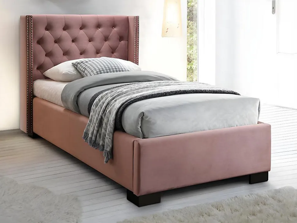 Avec son look velours capitonné et la solidité de sa structure en MDF et bois, ce lit MASSIMO va vite devenir l’élément clé de votre chambre ! Caractéristiques Couleur (nuance) : Rose Matière (précision) : 100 % Polyester, Mdf, Velours Structure : Bois, MDF, Contreplaqué Finition : Capitonné Taille (couchage) : 90 x 200 cm Nombre de places : 1 place Sans matelas Avec sommier Type de sommier : Cadre à lattes Nombre de lattes : 13 lattes Gamme : Made for design, Good for Planet Produit : Structure issue de forêts gérées durablement Charge maximale supportée : 230 kg À monter soi-même : 4 pieds inclus : Ce lit est compatible avec tous les matelas 90 x 200 cm Poids du lit : 47,4 kgDimensions Longueur : 216 cm Hauteur : 111.5 cm Profondeur : 114 cm Hauteur du lit sans la tête de lit : 37.5 cmLivraisonLors de la livraison, il est conseillé de vérifier que le bon nombre de colis a été livré.ColisColis n°1 : Longueur 151 cm, Largeur 112 cm, Hauteur 12 cm, Poids 21 kg. Colis n°2 : Longueur 209 cm, Largeur 45 cm, Hauteur 26 cm, Poids 26 kg.