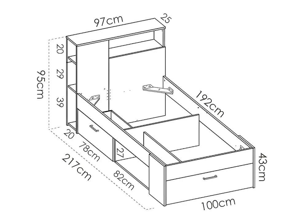 Avec sa tête de lit composée de rangements, ses 2 tiroirs, ses 2 niches latérales et son coffre en bout de lit, le lit LEANDRE allie l’utile à l’agréable en vous permettant de ranger vos livres, votre linge de lit, vos vêtements et bien d’autres choses. Caractéristiques Couleur (nuance) : Blanc Matière (précision) : Panneau de particule Finition : Mélaminé Taille (couchage) : 90 x 190 cm Nombre de places : 1 place Réversible Sans matelas Sans sommier Type de rangement : 1 tiroir, 5 niches 1 coffre Tiroir coulissant Produit : Fabriqué en Europe À monter soi-même : 1 coffre de rangement en bout de lit : 1 tête de lit avec 4 niches : 1 niche latérale : Ce lit est compatible avec tous les matelas et les sommiers 90×190 cmDimensions Longueur : 218.5 cm Hauteur : 95 cm Profondeur : 99.6 cm Tiroir : L72.6 x P35 x H15 cmLivraisonLors de la livraison, il est conseillé de vérifier que le bon nombre de colis a été livré.ColisColis n°1 : Longueur 199 cm, Largeur 36 cm, Hauteur 7 cm, Poids 26 kg. Colis n°2 : Longueur 115 cm, Largeur 65 cm, Hauteur 10 cm, Poids 37 kg.