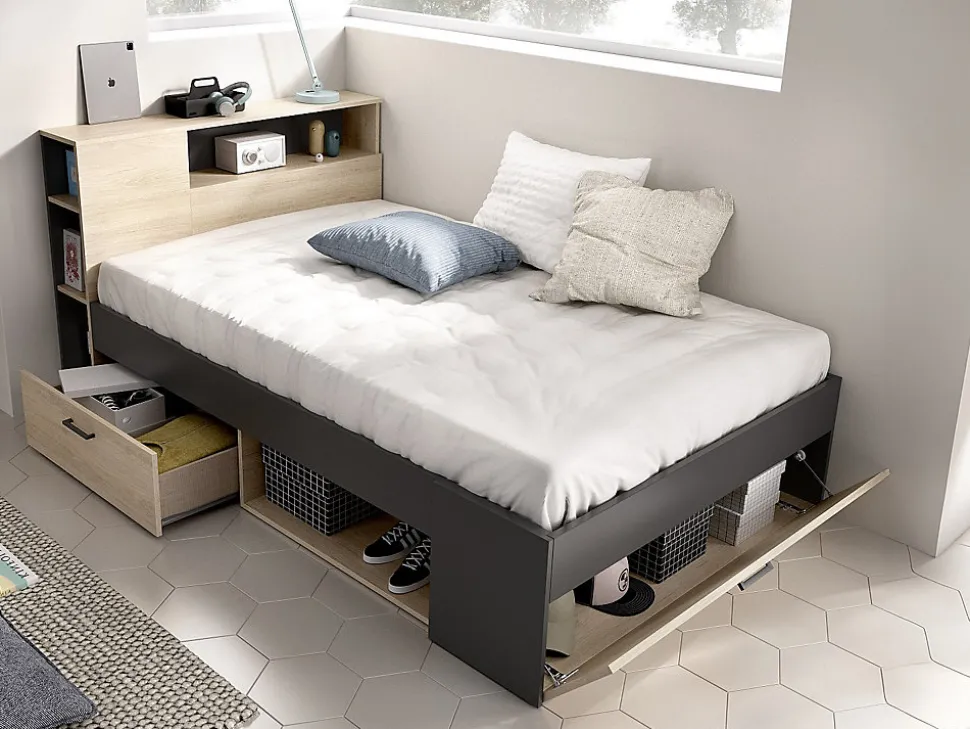 - Lit 120 x 190 cm avec tête de lit rangements et tiroirs – Structure : Panneaux de particules – Coloris : Naturel et anthracite – Style : Intemporel – Dimensions : L217,3 x P129,6 x H95 cm + Sommier – LEANDRE répondra à toutes vos attentes !