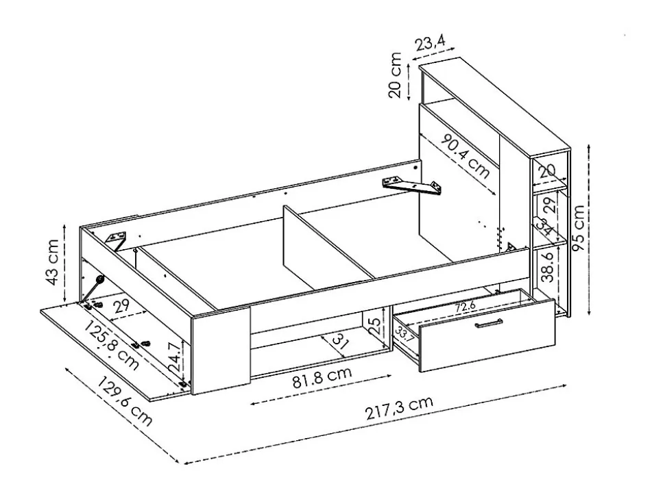 Avec sa tête de lit composée de rangements, ses 2 tiroirs, ses 2 niches latérales et son coffre en bout de lit, le lit LEANDRE allie l’utile à l’agréable en vous permettant de ranger vos livres, votre linge de lit, vos vêtements et bien d’autres choses. 1 x Cadre de lit LEANDRECaractéristiques Couleur (nuance) : Naturel clair, Gris anthracite Matière (précision) : Panneau de particule Finition : Mélaminé Taille (couchage) : 120 x 190 cm Nombre de places : 1 place Réversible Sans matelas Type de rangement : 1 tiroir, 5 niches 1 coffre Tiroir coulissant Produit : Fabriqué en Europe Charge maximale supportée : 120 kg À monter soi-même : 1 niche latérale : 1 tête de lit avec 4 niches : 1 coffre de rangement en bout de lit : Ce lit est compatible avec tous les matelas et sommiers en 120 x 190 cmDimensions Longueur : 217.3 cm Hauteur : 95 cm Profondeur : 129.6 cm Hauteur de couchage : 43 cm Tiroirs : L72,6 x P33,7 x H15 cm1 x Cadre à lattes KALISTACaractéristiques Couleur (nuance) : Noir Matière (précision) : Métal Epaisseur métal : 1.2 mm Taille (couchage) : 120 x 190 cm Nombre de places : 1 place Sans pieds Technologie (sommier) : Lattes actives Nombre de lattes : 38 lattes Matière des lattes : Bois (peuplier) Charge maximale supportée : 250 kg À monter soi-même : Cadre métal laqué epoxy cintré sur chantDimensions Longueur : 188 cm Hauteur : 5 cm Profondeur : 118 cmLivraisonLors de la livraison, il est conseillé de vérifier que le bon nombre de colis a été livré.Colis1 x Cadre de lit LEANDREColis n°1 : Longueur 200 cm, Largeur 46 cm, Hauteur 8 cm, Poids 34 kg. Colis n°2 : Longueur 137 cm, Largeur 76 cm, Hauteur 9 cm, Poids 39 kg. 1 x Cadre à lattes KALISTAColis n°1 : Longueur 192 cm, Largeur 32 cm, Hauteur 7 cm, Poids 18 kg.