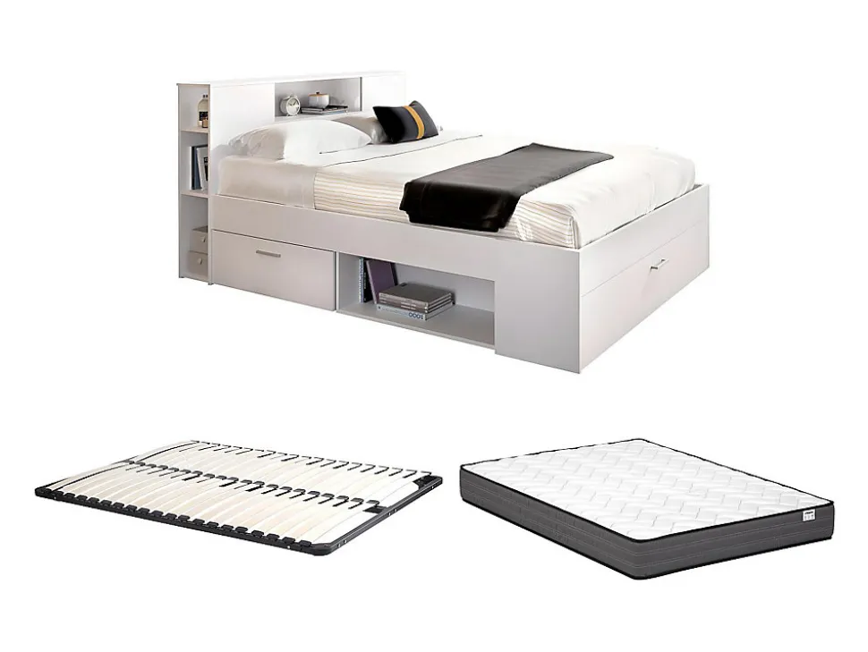 Avec sa tête de lit composée de rangements, ses 2 tiroirs, ses 2 niches latérales et son coffre en bout de lit, le lit LEANDRE allie l’utile à l’agréable en vous permettant de ranger vos livres, votre linge de lit, vos vêtements et bien d’autres choses. 1 x Cadre de lit LEANDRECaractéristiques Couleur (nuance) : Blanc Matière (précision) : Panneau de particule Finition : Mélaminé Taille (couchage) : 160 x 200 cm Nombre de places : 2 places Réversible Type de rangement : 2 tiroirs, 9 niches 1 coffre Tiroir coulissant , Espace pro Produit : Fabriqué en Europe À monter soi-même Niches latérales : 2 : 1 tête de lit avec 7 niches : 1 coffre de rangement en bout de lit : Ce lit est compatible avec tous les matelas et sommiers 160×200 cmDimensions Longueur : 228.5 cm Hauteur : 95 cm Profondeur : 169.5 cm Tiroirs : L78 x P35 x H15 cm1 x Matelas classique AMBRACIECaractéristiques Technologie (âme) : Ressorts ensachés Nombre de ressorts (matelas) : 580 Soutien : Equilibré Technologie matelas (accueil) : Mousse de confort Densité (accueil) : 23 kg/m³ Accueil : Tonique Garnissage du matelas : Fibres de polyester Coutil (matière) : Coutil stretch Couleur (nuance) : Blanc Matière (précision) : 100 % Polyester Taille (couchage) : 160 x 200 cm Nombre de places : 2 places Indépendance de couchage : Indépendance de couchage Réversible été/hiver, Carénage Gamme : Good for Planet Garantie : 5 ans Produit : Fabriqué en Europe Compressé/roulé : Compressé/rouléDimensions Longueur : 200 cm Hauteur : 20 cm Profondeur : 160 cm Epaisseur matelas : 20 cm Hauteur de l’âme : 15 cm1 x Cadre à lattes KALISTACaractéristiques Couleur (nuance) : Noir Matière (précision) : Métal Epaisseur métal : 1.2 mm Taille (couchage) : 160 x 200 cm Nombre de places : 2 places Sans pieds Technologie (sommier) : Lattes actives Nombre de lattes : 38 lattes Matière des lattes : Bois (peuplier) Charge maximale supportée : 250 kg À