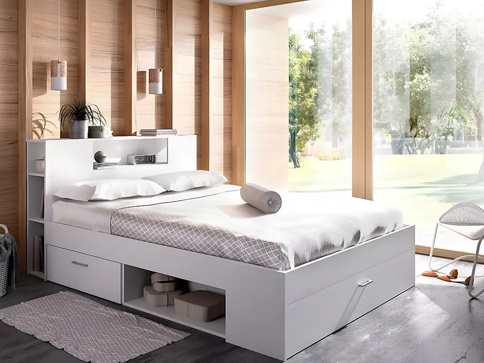 - Lit avec tête de lit rangements et tiroirs LEANDRE – 160 x 200 cm – Coloris : Blanc – Matériaux : Panneaux de particules – Rangements : 2 tiroirs, 1 coffre et 9 niches – Dim : L228,5 x P169,5 x H95 cm – Style : Intemporel+ Sommier + Matelas