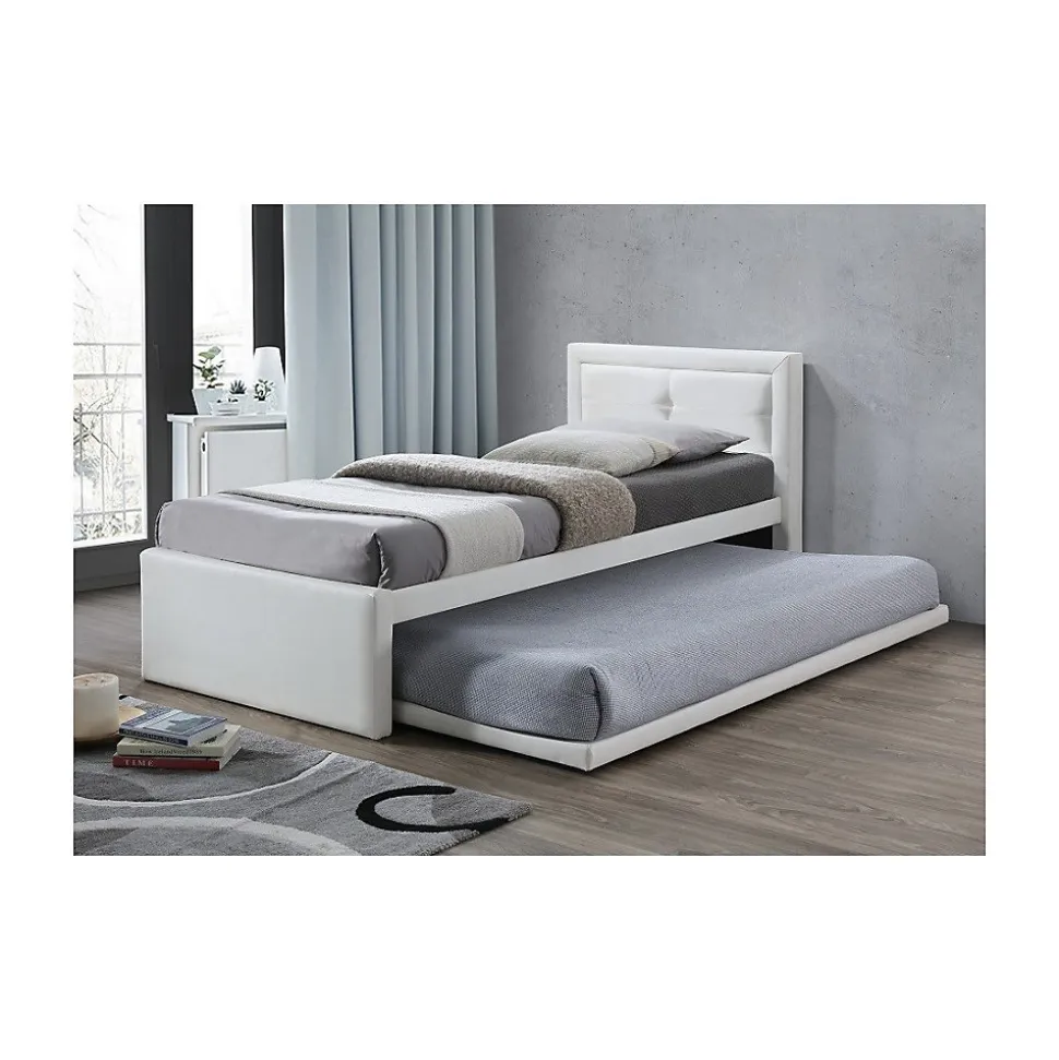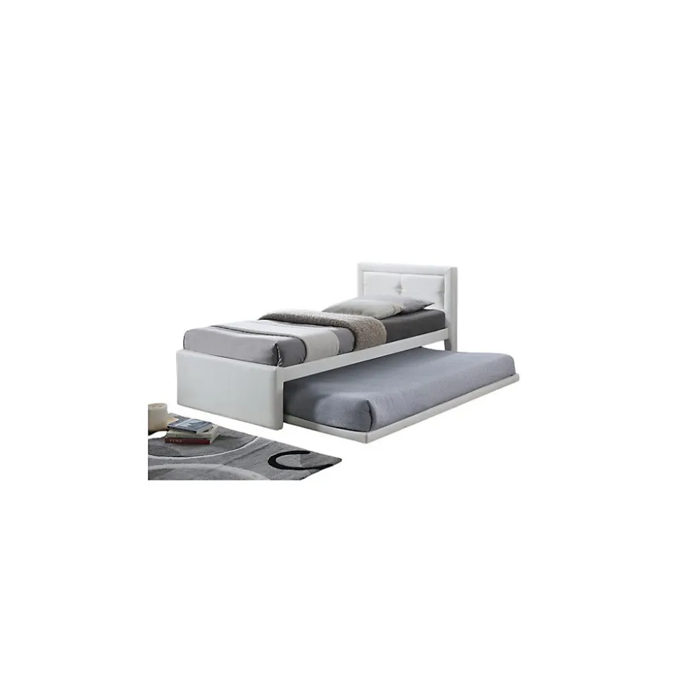 Lit avec tiroir-lit RODAN – 90×200 cm – Similicuir blanc – Sommier inclusLe lit RODAN est un choix idéal pour ceux qui recherchent un meuble fonctionnel et élégant. Son revêtement en similicuir blanc lui confère un aspect raffiné et moderne, parfait pour une chambre lumineuse et contemporaine. Doté d’un tiroir-lit intégré, il offre un couchage supplémentaire discret et pratique. Son sommier à 12 lattes garantit un excellent soutien et un confort optimal.Caractéristiques du produit :Type de produit : Lit avec tiroir-litCollection : RODANDimensions : L221 cm x P102 cm x H120 cmDimensions tiroir-lit : L197 cm x P90,5 cm x H8,5 cmMatériau : Similicuir et structure robusteColoris : Blanc (existe également en noir)Type de sommier : Sommier inclus (12 lattes)Matelas : Non inclusAvantages du lit RODAN :Design élégant : Son revêtement en similicuir blanc apporte une touche chic et moderne à votre chambre.Fonctionnalité : Son tiroir-lit intégré permet un couchage d’appoint pratique pour optimiser l’espace.Confort et robustesse : Son sommier à lattes assure un excellent maintien pour un sommeil réparateur.Pourquoi choisir le lit RODAN ?Esthétique et praticité : Un design élégant combiné à une solution de couchage modulable.Facilité d’entretien : Le revêtement en similicuir est résistant et simple à nettoyer.