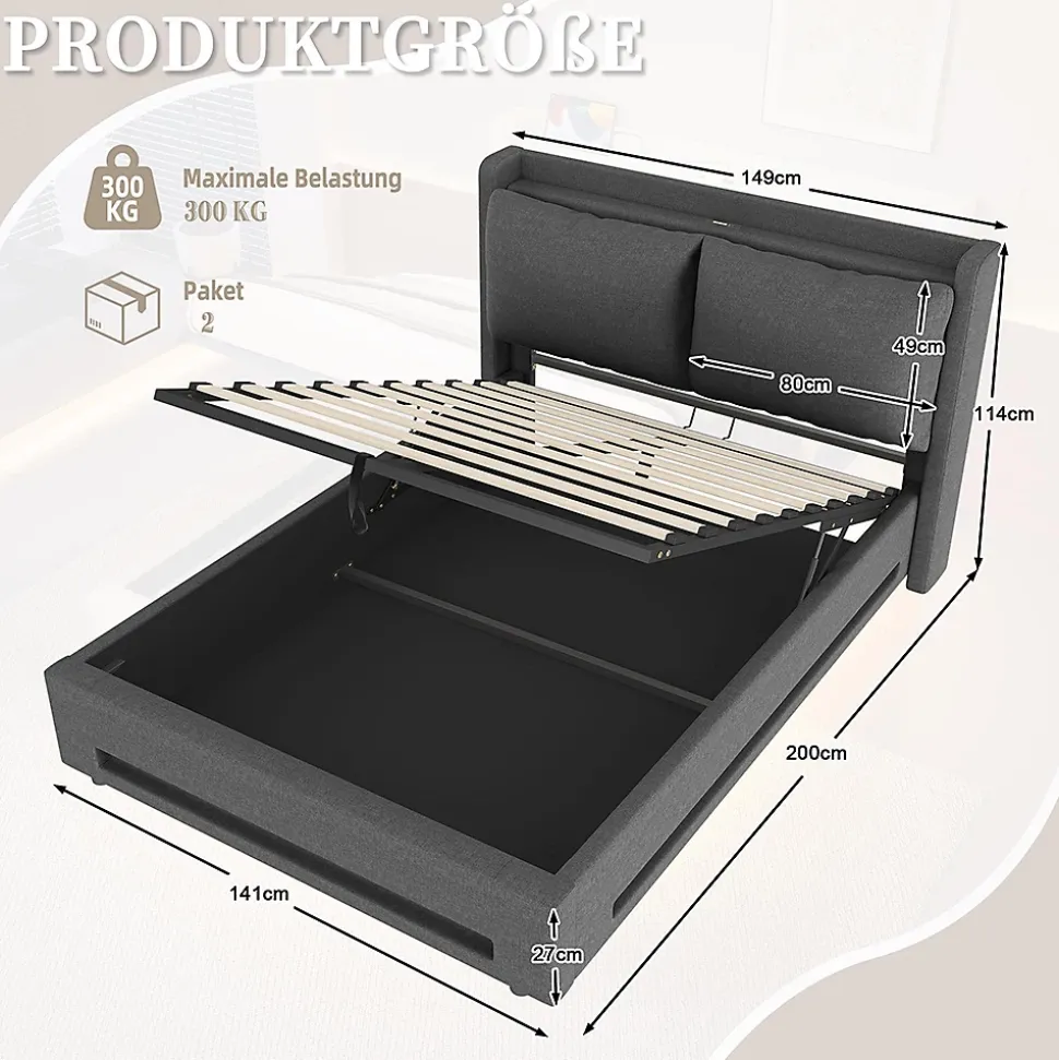 - Design unique de la tête de lit – La tête de lit offre un espace de rangement ouvert pour les livres, les lunettes ou les objets décoratifs et est également équipée d’un port USB de type C et d’une veilleuse pratique. Confort et fonctionnalité en un.