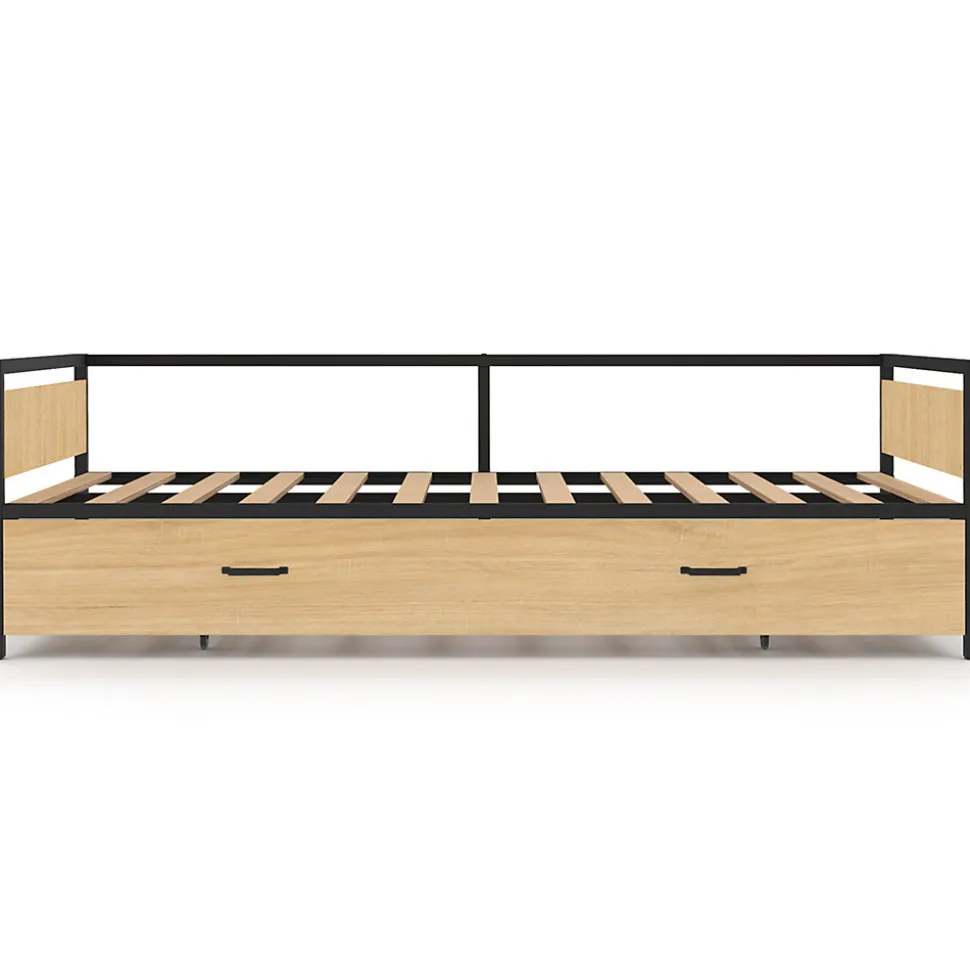 À la recherche d’une banquette convertible, à la fois esthétique et pratique ? Optez pour le lit gigogne DETROIT de 90 x 190 cm au coloris bois et noir. Ce lit gigogne au style industriel et aux lignes épurées ne manquera pas d’apporter du caractère à votre intérieur, tout en offrant un couchage supplémentaire, grâce à son option gigogne. Couchage 2 en 1, cette banquette convertible est idéale pour une chambre d’amis, un appartement étudiant ou même dans votre salon en guise de banquette, en la plaçant contre un mur avec quelques coussins.Grâce à cette banquette convertible, vous pouvez optimiser l’agencement de la pièce : un lit 2 places une fois déplié et un lit indépendant ou banquette lorsque vous le repliez. Une solution gain de place qui ne risque pas d’envahir les petits espaces ! Le sommier du couchage principal se compose de 13 lattes et le sommier du couchage secondaire, 11 lattes. Pour déplier votre couchage, c’est très simple, il vous suffit de tirer sur le sommier du second couchage grâce à son système de roulettes et de déplier ses pieds. Vous bénéficiez ainsi d’un véritable lit double à compléter d’un matelas. Alors n’hésitez plus et craquez pour le lit gigogne DETROIT, la solution idéale pour optimiser l’espace de votre pièce !Matelas non vendu avec la banquette convertible.La banquette peut accueillir un matelas jusqu’à 25 cm d’épaisseur. Dimensions du lit gigogne DETROIT 90 x 190 cmDimensions globales du lit plié : Longueur 201 cm x largeur 95.5 cm x Hauteur 61 cmDimensions intérieures du lit principal : L. 195 x l. 92.5 cmCouchage lit plié : 90 x 190 cmDimensions globales du lit déplié : L.201 cm x l.184 cm x H.61 cmCouchage lit déplié : 180 x 190 cmHauteur des pieds : 29.5 cmDimension poignée : 9.5 cmNombre de lattes : 13Distance entre chaque latte : 10 cmÉpaisseur des lattes : 1.5 cmÉpaisseur bois rebords : 1.5 cmHauteur sommier : 31 cmDimensions banquette : L. 192.5 x l. 88.5 cm – 4 roulettesNombre de latte banquette : 11Matériaux : Particules