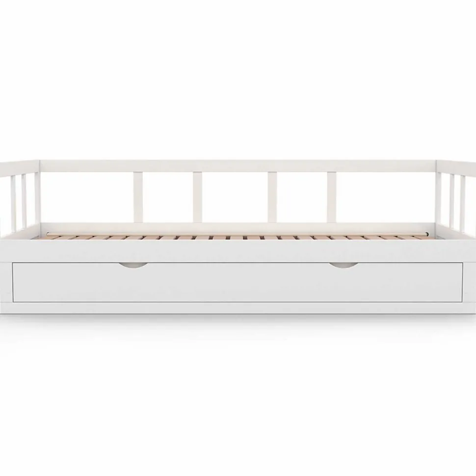 Craquez pour le lit gigogne ZOYA et profitez d’un couchage à la fois pratique et gain de place pour aménager votre bureau, une chambre d’amis ou encore un appartement étudiant !Ce lit est le parfait compromis entre optimisation de l’espace et confort de couchage, grâce à sa banquette coulissante.En effet, lorsqu’elle est pliée, cette banquette 90×190 cm prend peu de place : elle peut être utilisée aussi bien en lit 1 place qu’en canapé !Dépliez la banquette en coulissant simplement la façade vers vous et profitez ainsi d’un grand et confortable lit 2 places de 180×190 cm ! Ce lit gigogne est donc l’allié parfait lorsqu’on souhaite pouvoir accueillir ponctuellement du monde à dormir sans pour autant encombrer quotidiennement la pièce dans lequel il se trouve.Cette banquette convertible est également idéale dans un appartement étudiant car elle peut servir à la fois de canapé et de lit, pratique lorsqu’on vit dans un petit espace.Ce lit gigogne ZOYA comprend également un grand tiroir en façade de 178.5 x 32 cm ! Vous pourrez ainsi y ranger aussi bien du linge de lit ou de maison que des affaires personnelles pour les conserver à portée de main.Le design blanc et épuré de ce lit d’appoint s’intègrera parfaitement dans tous types de décoration intérieure pour un espace de vie à la fois sobre et moderne ! Lit vendu sans matelas. A compléter avec 2 matelas 1 place de 90×190 cm.Dimensions du lit banquette gigogne ZOYA Dimensions globales plié : Longueur 194 x largeur 95 x Hauteur 60 cm Dimensions globales déplié : Longueur 194 x largeur 181.5 x Hauteur 60 cm Dimension intérieur du tiroir : 178.5 x 32.5 cm Nombre de lattes : 23 Distance entre les lattes : 2.5 cm Largeur des lattes : 6 cm Épaisseur des lattes : 1.2 cm Épaisseur structure / rebord : 1.8 cm Hauteur barreau : 30 cm Hauteur sommier : 23.5 cm Matériaux : MDF Coloris : blanc À monter soi-mêmeRetrouvez l’ensemble de nos lits sur notre boutique en ligne !
