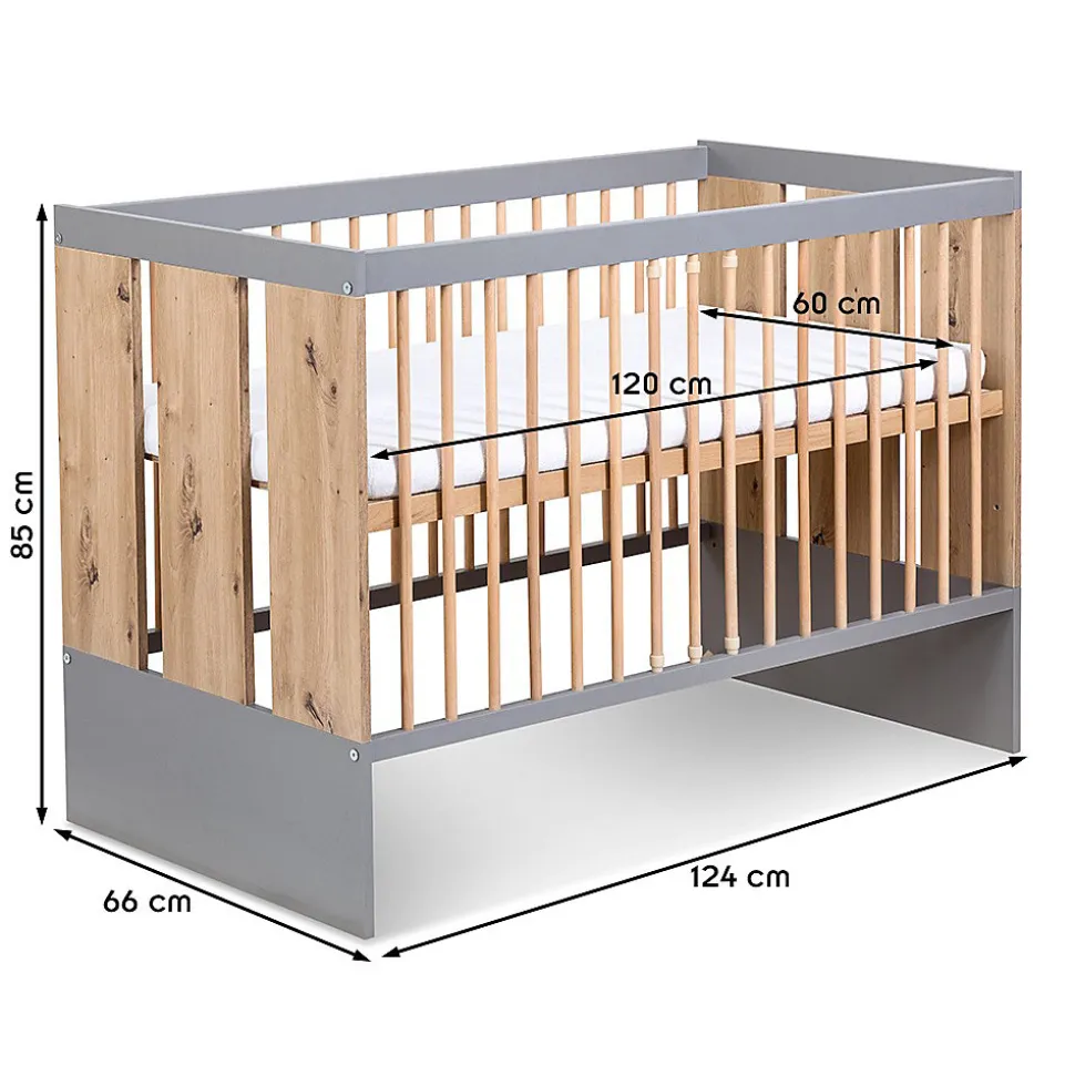 PAULINE Lit bébé enfant 120 x 60 avec sommier réglable Dès la naissance. CARACTÉRISTIQUES : Ce lit séduit par son style qui allie rustique et moderne. Ce lit s’adapte à la croissance de l’enfant grâce à son sommier réglable sur 3 hauteurs. 3 barreaux sont amovibles sur un des côtés afin que l’enfant puisse se coucher et se lever en toute liberté. Lorsque votre enfant grandit, vous pouvez remplacer un côté du lit par une barrière de sécurité incluse. Fabriqué en bois de pin et MDF. Peinture à l’eau. Fabriqué en Union Européenne. À monter. Matelas non inclus. DIMENSIONS ET POIDS : Dimensions extérieures du lit : L 124 cm x l 66 cm x H 85 cm. Dimensions intérieures du lit : L 120 cm x l 60 cm. Poids : 22 kg. À NOTER : pas de livraison en Corse ou sur les îles.