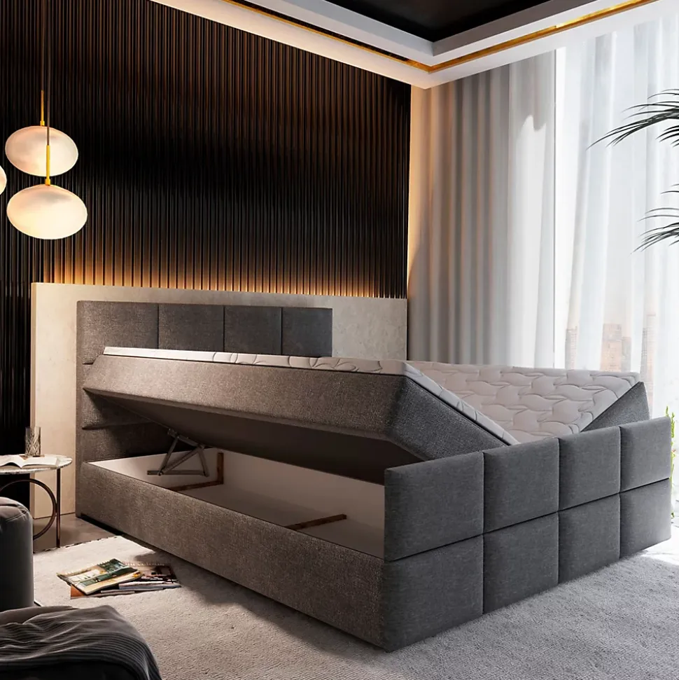Lit Masseno ARIEL 160×200 cm – Confort et FonctionnalitéLe lit ARIEL est la combinaison parfaite d’une élégance intemporelle et d’une ergonomie pensée pour votre bien-être. Ce modèle offre non seulement un design soigné, mais aussi une fonctionnalité maximale grâce à ses espaces de rangement et son confort de couchage supérieur.Caractéristiques principales : Matelas à ressorts Bonell : Assure un soutien progressif qui s’adapte dynamiquement au poids du corps. La structure garantit une ventilation optimale et une isolation phonique pour un sommeil sain et calme. Confort accru (Surmatelas) : Le lit est équipé d’un surmatelas qui rend la surface de couchage plus douce, améliorant considérablement la qualité de votre repos. Grands coffres de lit : Fabriqués en panneau stratifié robuste, ils offrent un vaste espace pour votre literie. L’accès est facilité par un mécanisme d’ouverture assistée qui réduit l’effort de levage. Construction solide : Le cadre en bois massif et panneau de particules assure la stabilité du lit et empêche le matelas de glisser. Montage simple : Assemblage rapide et sans effort grâce au système de crochets métalliques. Dimensions : Longueur totale : 214 cm Largeur totale : 160 cm Hauteur de la tête de lit : 98 cm Hauteur d’assise avec surmatelas : 49 cm Hauteur des pieds : 2 cm Dureté du matelas : H2/H3 Surface de couchage : 160×200 cm