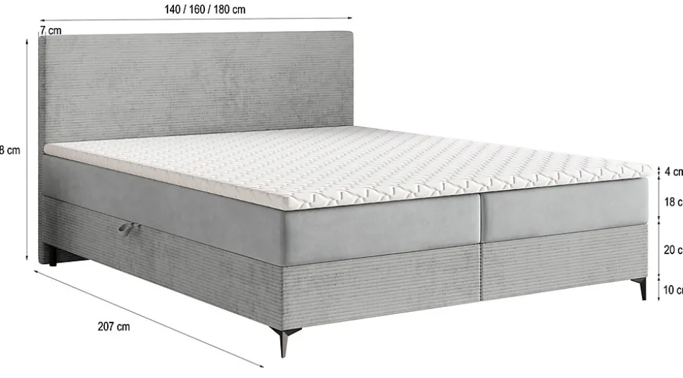 Lit Masseno TORREL 140×200 cm – Confort et FonctionnalitéLe lit TORREL est la combinaison parfaite d’une élégance intemporelle et d’une ergonomie pensée pour votre bien-être. Ce modèle offre non seulement un design soigné, mais aussi une fonctionnalité maximale grâce à ses espaces de rangement et son confort de couchage supérieur.Caractéristiques principales : Matelas à ressorts Bonell : Assure un soutien progressif qui s’adapte dynamiquement au poids du corps. La structure garantit une ventilation optimale et une isolation phonique pour un sommeil sain et calme. Confort accru (Surmatelas) : Le lit est équipé d’un surmatelas qui rend la surface de couchage plus douce, améliorant considérablement la qualité de votre repos. Grands coffres de lit : Fabriqués en panneau stratifié robuste, ils offrent un vaste espace pour votre literie. L’accès est facilité par un mécanisme d’ouverture assistée qui réduit l’effort de levage. Construction solide : Le cadre en bois massif et panneau de particules assure la stabilité du lit et empêche le matelas de glisser. Montage simple : Assemblage rapide et sans effort grâce au système de crochets métalliques. Dimensions : Longueur totale : 207 cm Largeur totale : 140 cm Hauteur de la tête de lit : 98 cm Hauteur d’assise avec surmatelas : 52 cm Hauteur des pieds : 10 cm Dureté du matelas : H2/H3 Surface de couchage : 140×200 cm