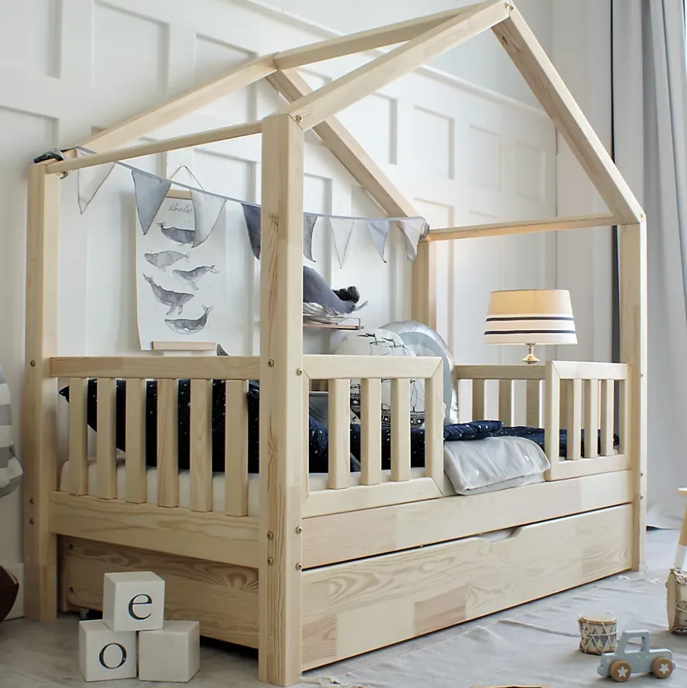 Lit cabane 90×190 barrières sommier et tiroir inclus Roxane Bois