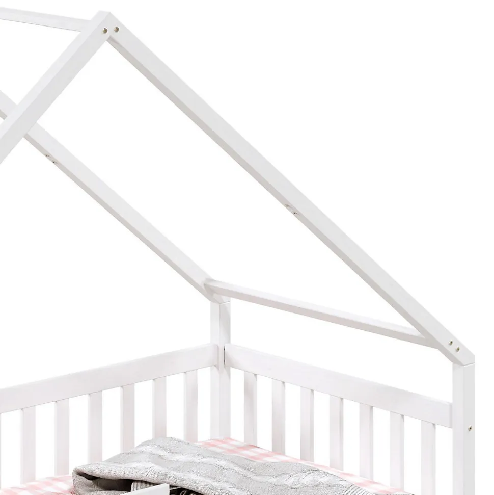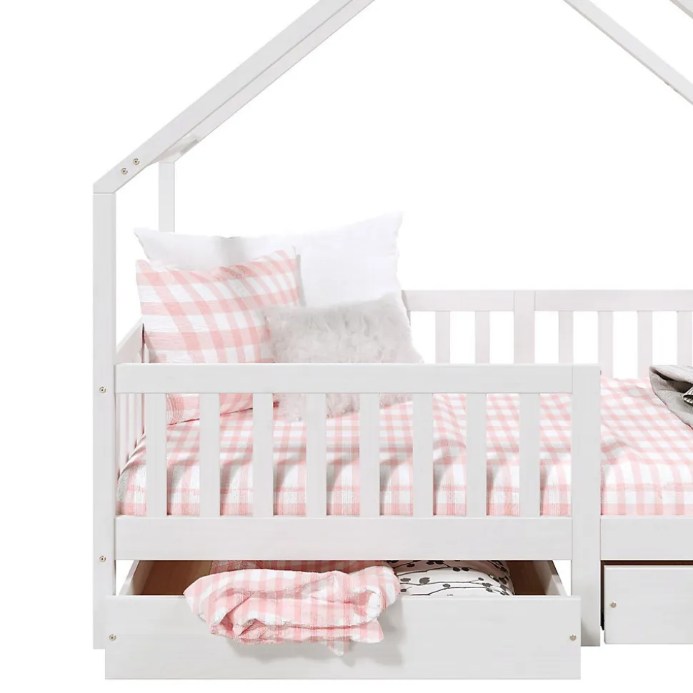 Le lit cabane Alva … trouvera parfaitement sa place dans tous les espaces, même mansardés, grâce à son design asymétrique. Ce lit en forme de maisonnette raviera votre enfant qui pourra l’utiliser comme coin de jeux en journée, et y passer une douce nuit. Avec ses 2 grands tiroirs, vous pourrez facilement y ranger tous les jouets et linges de lit. Les barrières de protection assurent la sécurité de votre enfant et sa structure en pin massif pourra être agrémentée de décoration afin d’en faire un lieu confortable !. Description des matériaux : – La structure du lit est en pin massif et recouvert d’une lasure de coloris blanc. – La madrure du bois reste visible. Caractéristiques du produit : – Couchage: 90 x 200 cm – 2 tiroirs – Dimensions des tiroirs (L x H xP) : 89 x 16 x 92 cm – Sans sommier et sans matelas – Barre de renfort Livraison et montage : – Contenu de la livraison : Cadre de lit, sans décoration, notice de montage – Le produit est livré en pièces détachées – Assemblage facile grâce à la notice – Sans sommier et sans matelas – Photo non contractuelle Résumé: – Convient uniquement avec: Sommier fagot à lattes – Nombres de tiroirs: 2 – Sommier: vendu séparément – Hauteur façade: 16 mm cm – Largeur tiroir: 89 cm – Profondeur tiroir: 92 cm – Dimensions monté: 168 x 96 x 206 cm (H x L x L) – Couchage: 90 x 200 cm – Couleur: Blanc – Matériel: Pin massif