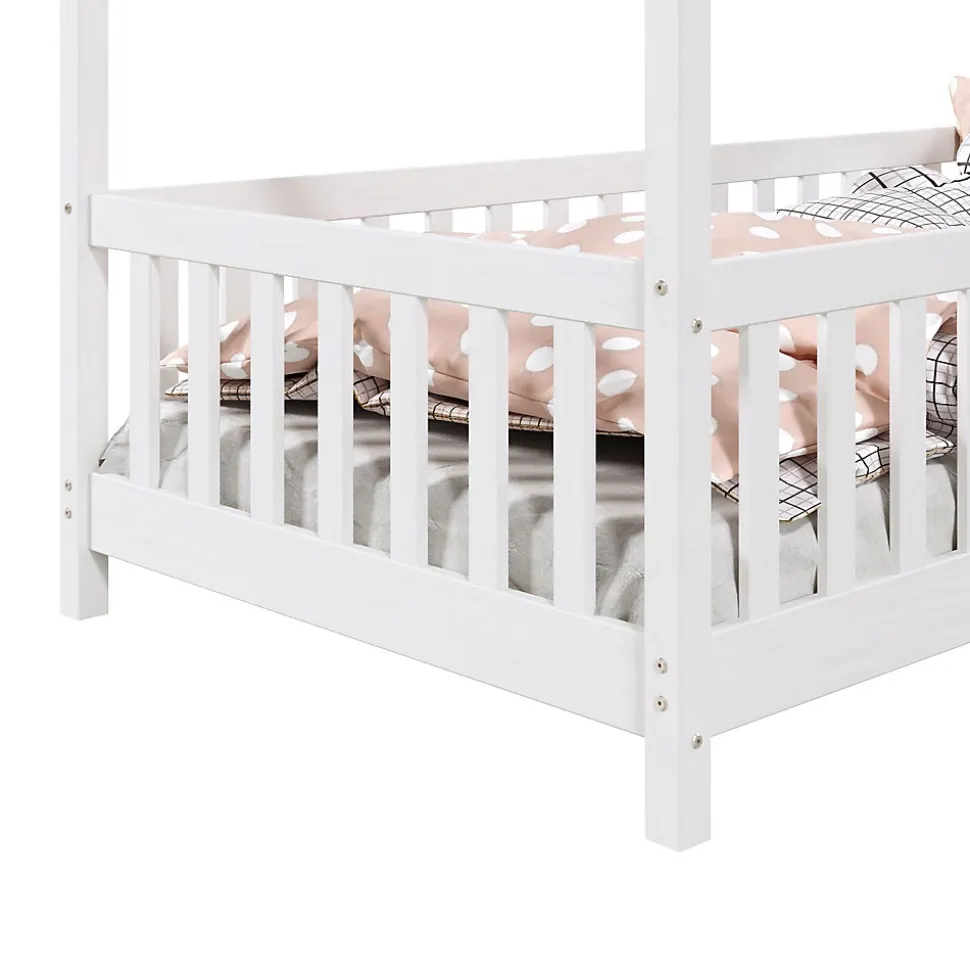 Le lit cabane Cora … deviendra rapidement l’endroit favori de votre enfant, que ce soit en journée pour y jouer ou la nuit pour y dormir paisiblement. Avec son design asymétrique, ce lit maisonnette pourra convenir à tous les espaces même mansardés. Sa structure proche du sol permettra à votre enfant d’entrer et sortir facilement du lit en toute autonomie. De plus les barrières de protection assurent sa sécurité durant son sommeil. Vous pourrez également y ajouter de la déCoration, guirlandes ou voilages, pour en faire un lieu confortable ! Description des matériaux : – La structure du lit est en pin massif et recouvert d’une lasure de coloris blanc. – La madrure du bois reste visible. Caractéristiques du produit : – Couchage: 90 x 190 cm – Position de la barrière modulable (droite ou gauche) – Sans sommier et sans matelas – Barre de renfort Livraison et montage : – Contenu de la livraison : Cadre de lit, sans déCoration, notice de montage – Le produit est livré en pièces détachées – Assemblage facile grâce à la notice – Sans sommier et sans matelas – Photo non contractuelle Résumé: – Dimensions pieds: 42 x 42 mm – Hauteur cadre de lit: 9 cm – Convient uniquement avec: Sommier fagot à lattes – Sommier: vendu séparément – Surface: Lasuré, La madrure du bois reste visible – Dimensions monté: 158 x 96 x 196 cm (H x L x L) – Couchage: 90 x 190 cm – Couleur: Blanc – Matériel: Pin massif