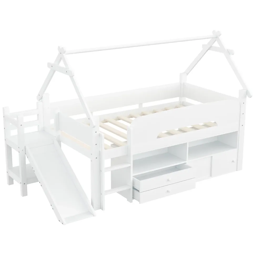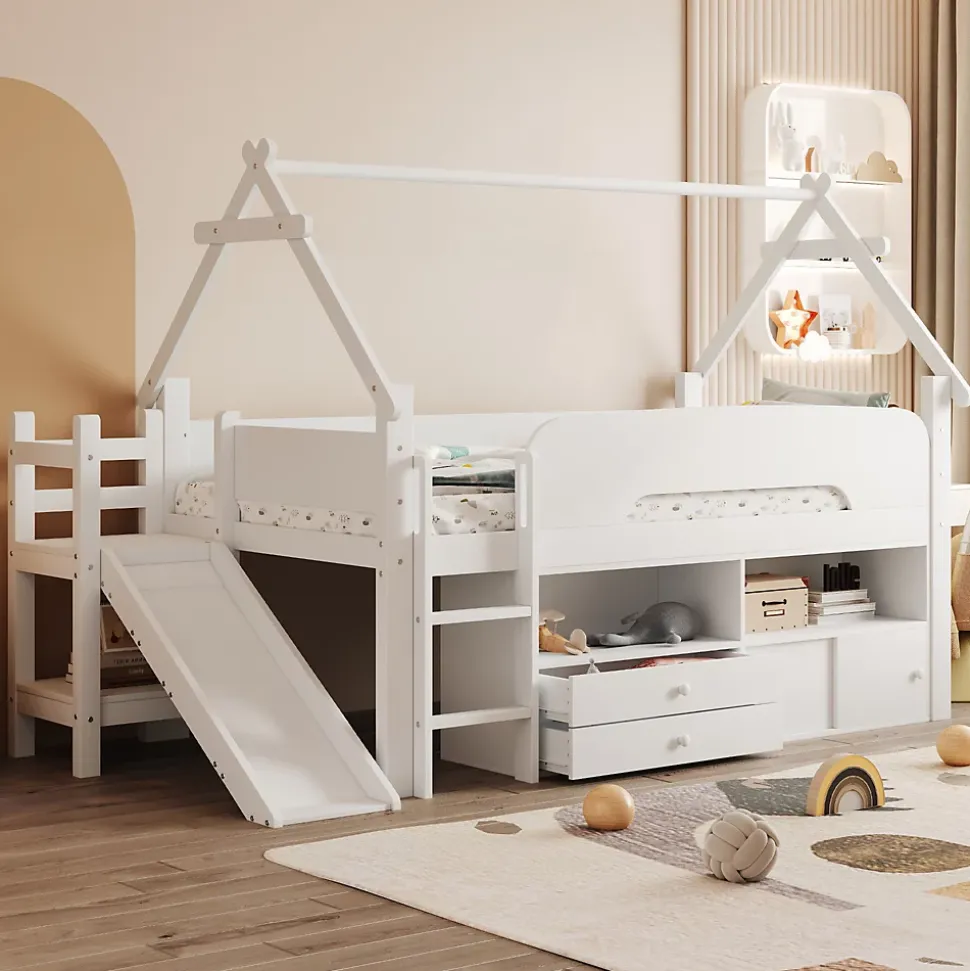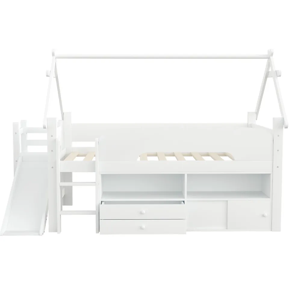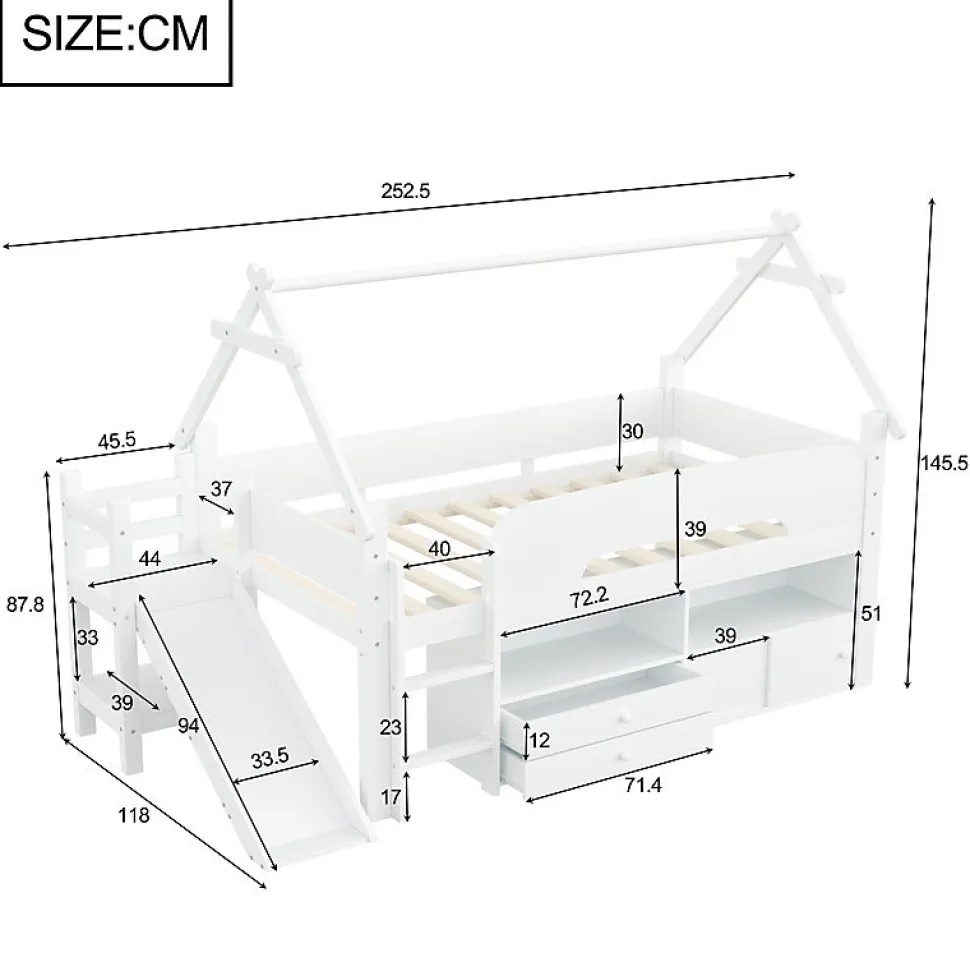 •【Conception gain de place】Ce lit mezzanine est idéal pour les petites chambres. Surélever le cadre de lit crée un espace de rangement supplémentaire en dessous. Il permet de garder la chambre bien rangée tout en offrant plus d’espace pour jouer ou d’autres activités.•【Toboggan amusant】Ce lit est équipé d’un toboggan intégré très amusant, permettant aux enfants de glisser en toute sécurité et de transformer l’heure du coucher en une aventure palpitante. Le toboggan est à la fois ludique et sûr, avec une surface lisse et une construction robuste.•【Barrières de sécurité robustes】Conçu avec la sécurité comme priorité absolue, ce lit est équipé de barrières de sécurité sur le lit supérieur pour assurer la sécurité des enfants pendant la nuit. Ces barrières rassurent les parents et permettent aux enfants de dormir paisiblement sans craindre les chutes.•【Nombreuses options de rangement】Diverses options de rangement sont disponibles sous le cadre de lit, notamment des étagères ouvertes, des tiroirs et des placards à portes coulissantes. Cet espace de rangement est suffisant pour les vêtements, les jouets, les livres et plus encore, contribuant ainsi à garder la chambre propre et organisée.•【Espace de jeu sous le lit】L’espace sous le lit mezzanine offre non seulement du rangement, mais aussi un véritable espace de jeu. Ce lit mezzanine offre un espace généreux pour les jouets et les équipements de jeu, permettant à votre enfant de dormir et de jouer au même endroit.•【Structure robuste et durable】Fabriqué avec des matériaux de haute qualité, ce lit mezzanine est à la fois durable et stable. Sa structure robuste assure un maintien optimal de votre enfant et résiste à l’usure quotidienne d’un enfant actif.•【Facile à assembler】Des instructions détaillées et des pièces complètes sont disponibles pour vous aider à réaliser l’assemblage rapidement.