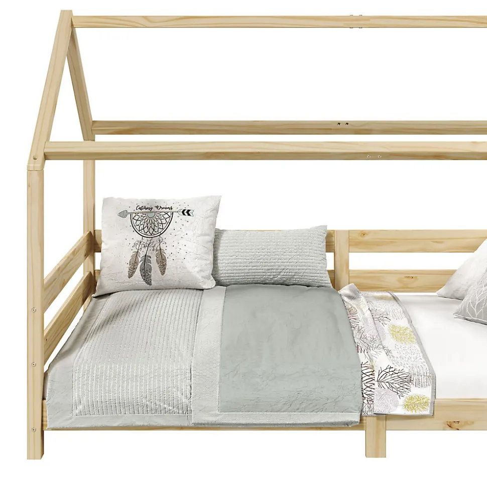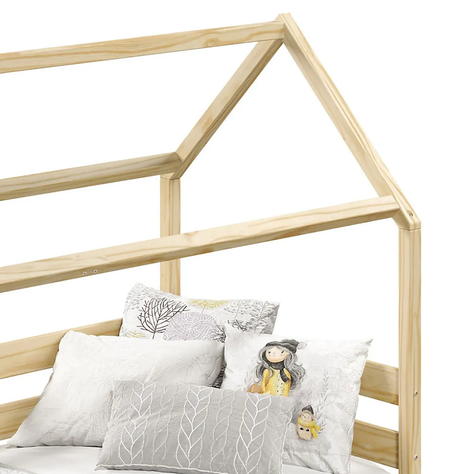 Le lit cabane Fina … apportera un plus dans la décoration de la chambre de votre enfant grâce à sa structure minimaliste en pin massif. Vous pourrez facilement le personnaliser en y accrochant des guirlandes, des voilages ou autres objets de décoration. Les barrières de protection sur 3 des côtés assureront la sécurité de votre enfant durant son sommeil. Et la partie ouverte lui permettra de monter et descendre facilement et en toute autonomie de son lit. Description des matériaux : – La structure du lit est en pin massif et recouvert d’un vernis à la finition naturelle. – La madrure du bois reste visible. Caractéristiques du produit : – Couchage: 90 x 190 cm – Sans sommier et sans matelas – Barre de renfort – Design en forme de cabane Livraison et montage : – Contenu de la livraison : Cadre de lit, sans décoration, notice de montage – Le produit est livré en pièces détachées – Assemblage facile grâce à la notice – Sans sommier et sans matelas – Photo non contractuelle Résumé: – Convient uniquement avec: Sommier fagot à lattes – Surface: La madrure du bois reste visible – Dimensions monté: 134 x 96 x 196 cm (H x L x L) – Couchage: 90 x 190 cm – Couleur: Naturel – Matériel: Pin massif