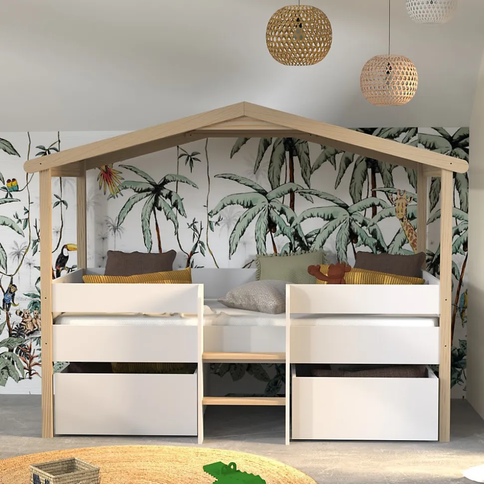 Offrez à votre enfant un cocon douillet pour des nuits paisibles avec ce lit cabane. La forme mignonne de la petite maison donne à la chambre des enfants une atmosphère animée. Il n’y a pas de limites à l’imagination, vous pouvez décorer le lit cabane avec votre enfant.Astucieux, il possède également deux grands tiroirs de rangement montés sur roulettes très pratique pour ranger jouets et linge de lit en un clin d’œil.Matériel: Bois massif, MDF et panneau de particules blancSommier à lattesToit en toile polyester beige pouvant être retirée pour le lavage.* Charge maximale d’utilisation : 80 kgDimensions:Zone de couchage 90x190cmLongueur : 213cmLargeur : 107cmHauteur : 166cmDimension d’un tiroir (en cm): 90x66x28ATTENTION le matelas et la décoration ne sont pas compris dans la livraison*Les couleurs réelles peuvent différer de ceux indiqué dans l’image en raison de la nature des paramètres de couleur de photographier et de moniteur.*Déconseillé aux enfants de moins de 4 ans. S’ils ne sont pas utilisés correctement, les lits cabanes peuvent présenter un risque de blessure par étranglement : ne rien suspendre au lit, ne pas se suspendre et ne pas sauter sur le lit.Support client et SAV en Français – Pas de livraison dans le DOM TOM et la Corse.**Attention la livraison est prévue au pied de l’immeuble ou de la maison et non à domicile.