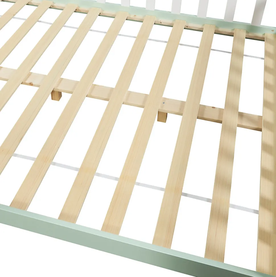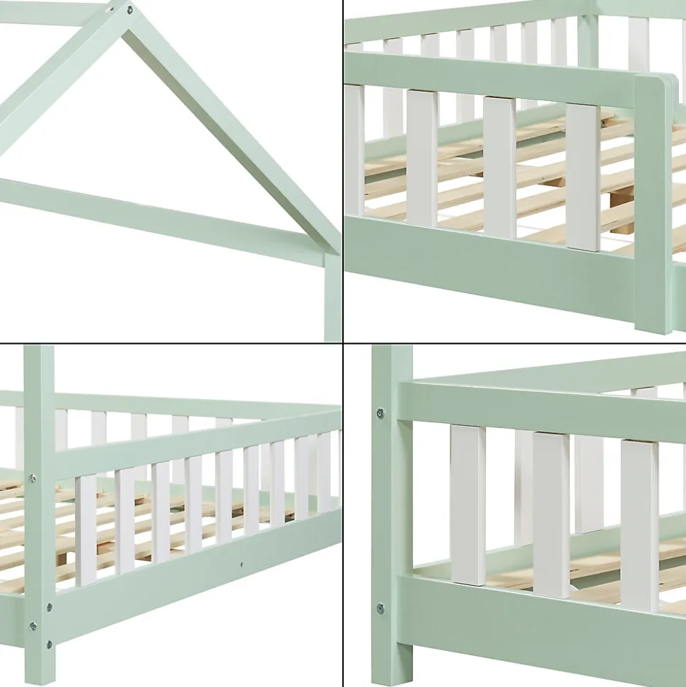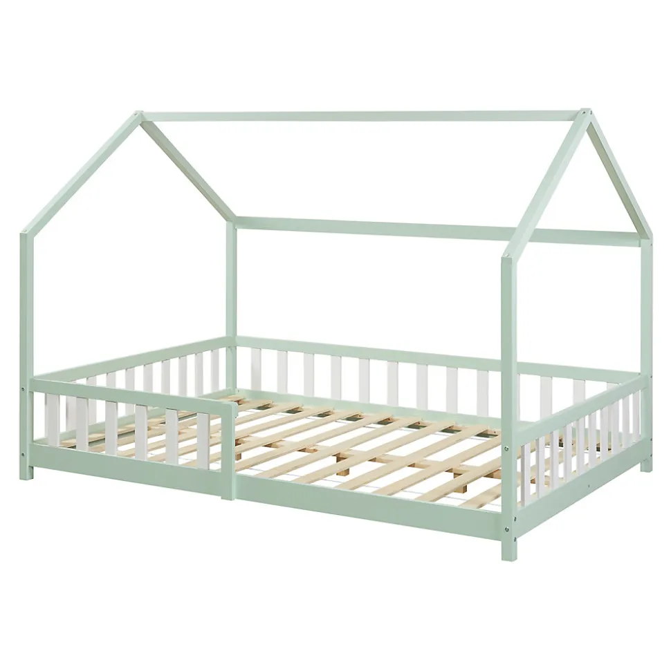 Lit enfantTransformez la chambre de votre enfant en un petit paradis accueillant pour dormir et jouer avec notre lit cabane en bois naturel. équipé d’une barrière protectrice à la fois décorative et utile, votre enfant sera toujours en sécurité pendant son sommeil. Avec son toit en forme de maison, il crée instantanément une ambiance cocooning. Qu’il s’agisse d’une chambre au design moderne ou classique, notre lit pour enfant s’adapte à tous les styles d’intérieur.Description :- lit cabane en forme de maison- s’adapte à différents styles de décoration- barrière protectrice pour un sommeil tranquille- construction robuste et montage facile- capacité de charge : 120 kgMatière :- cadre du lit : bois de pin- sommier : contreplaquéDimensions :- totales (longueur x largeur x hauteur) : 205 x 126 x 140 cm- surface de couchage (longueur x largeur) : 200 x 120 cm- distance entre le sol et le bas du toit : 94 cm- largeur de l’ouverture de la barrière : 97 cm- hauteur de la barrière : 40 cm- hauteur du pied : 5,5 cmCouleur :vert mentheContenu de la livraison :1 x lit enfant1 x sommier à lattes standard (modèle simple)A noter :Le matelas, l’oreiller, la couverture et tous les autres objets de décoration ne font pas partie de l’offre.Produit de la marque :[en.casa]