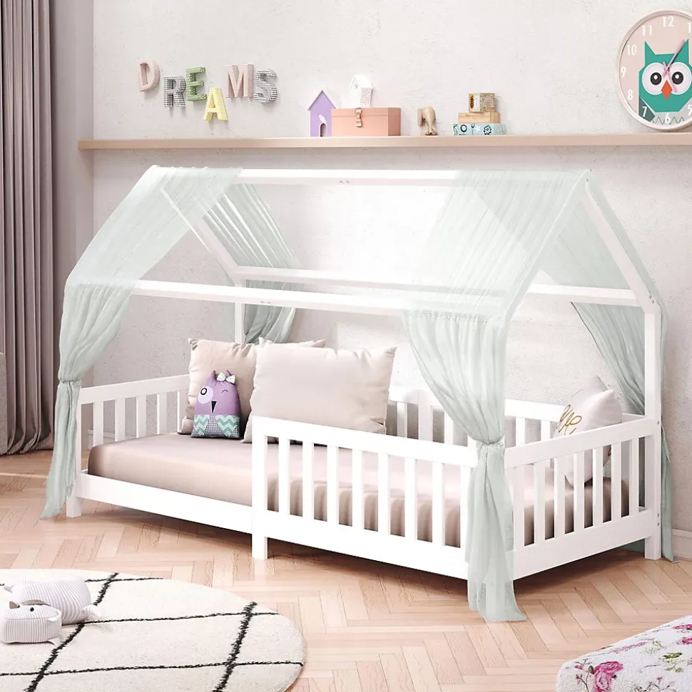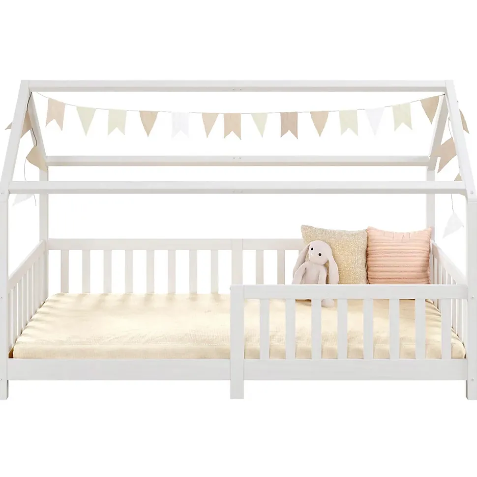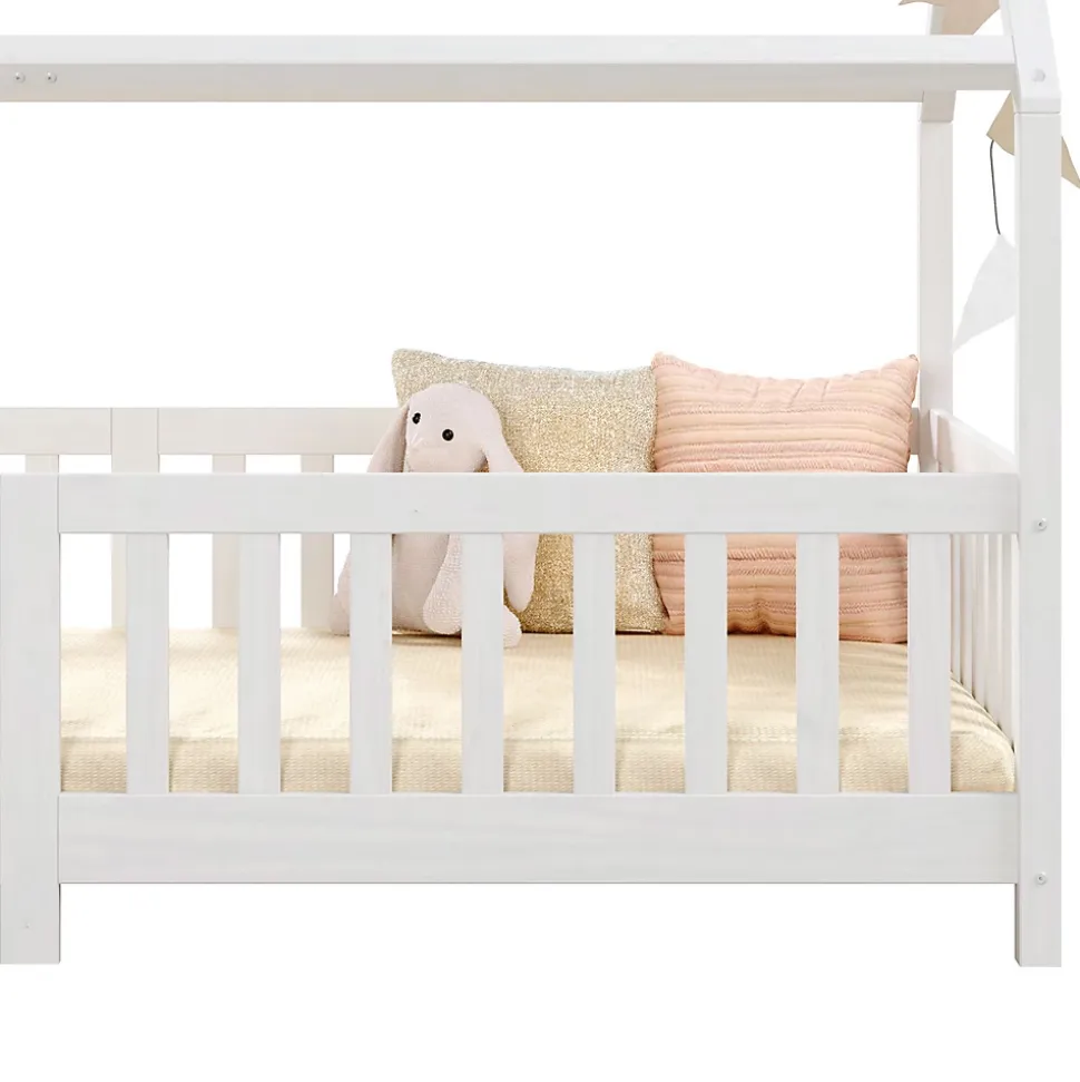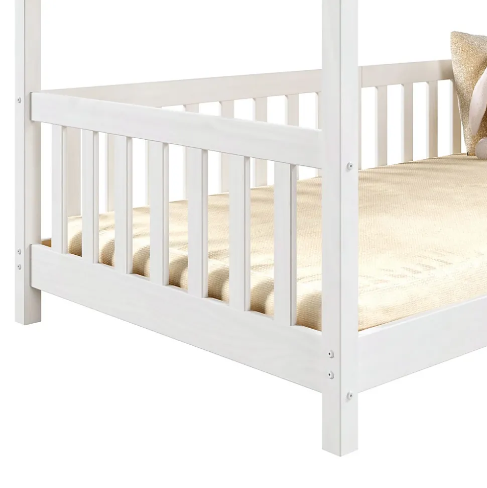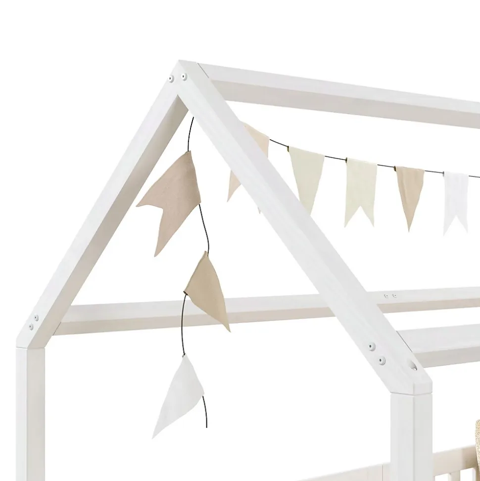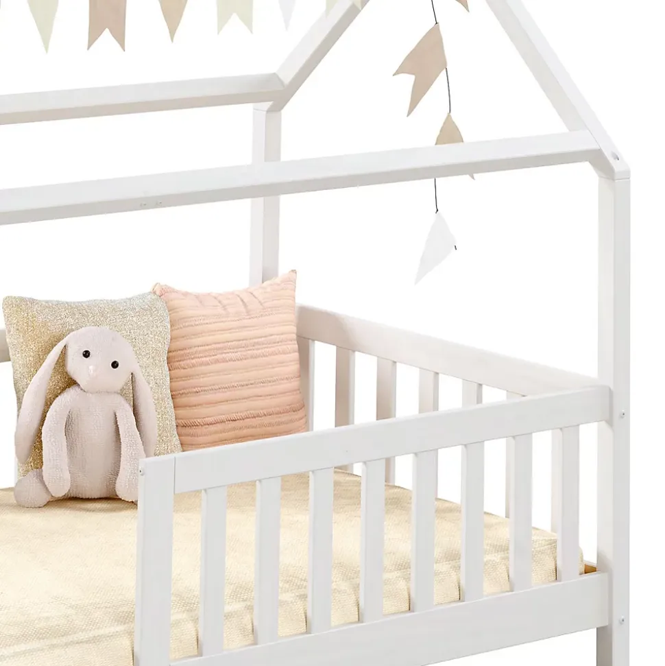 Le lit cabane Nina … sera parfait pour développer l’autonomie et l’indépendance de votre enfant. Le grand espace d’accés lui permettra d’entrer et de sortir facilement et en toute liberté de son lit. La sécurité est assurée par les barrières entourant le couchage afin d’éviter les chutes. Sa structure en forme de maisonnette et aux lignes épurées s’intégrera aisément quelque soit votre décoration ! Description des matériaux : – La structure du lit est en pin massif et recouvert d’une lasure de coloris blanc. – La madrure du bois reste visible. Caractéristiques du produit : – Couchage: 90 x 190 cm – Position de la barrière modulable (droite ou gauche) – Sans sommier et sans matelas – Barre de renfort – Design en forme de cabane Livraison et montage : – Contenu de la livraison : Cadre de lit, sans décoration, notice de montage – Le produit est livré en pièces détachées – Assemblage facile grâce à la notice – Sans sommier et sans matelas – Photo non contractuelle Résumé: – Convient uniquement avec: Sommier fagot à lattes – Surface: La madrure du bois reste visible – Dimensions monté: 135 x 96 x 196 cm (H x L x L) – Couchage: 90 x 190 cm – Couleur: Blanc – Matériel: Pin massif