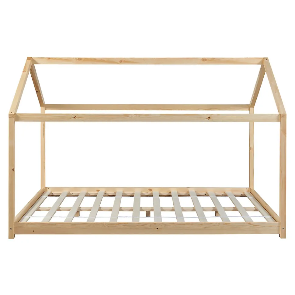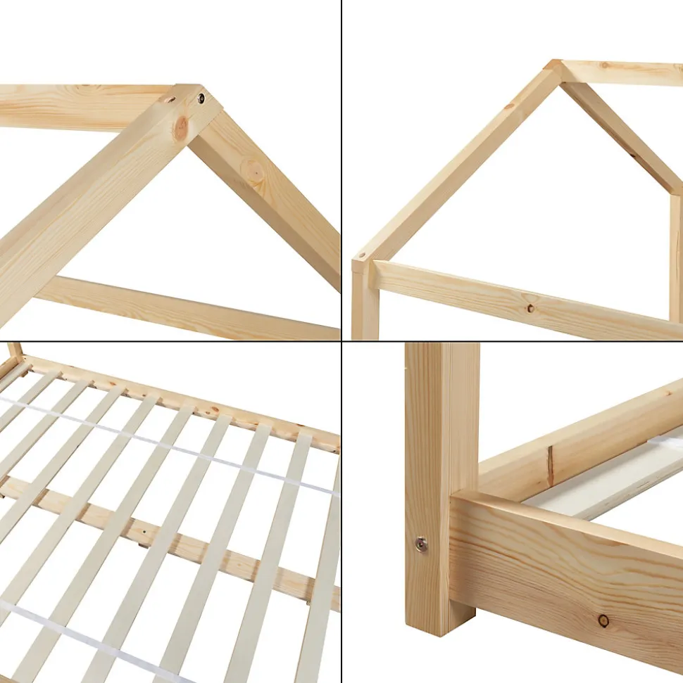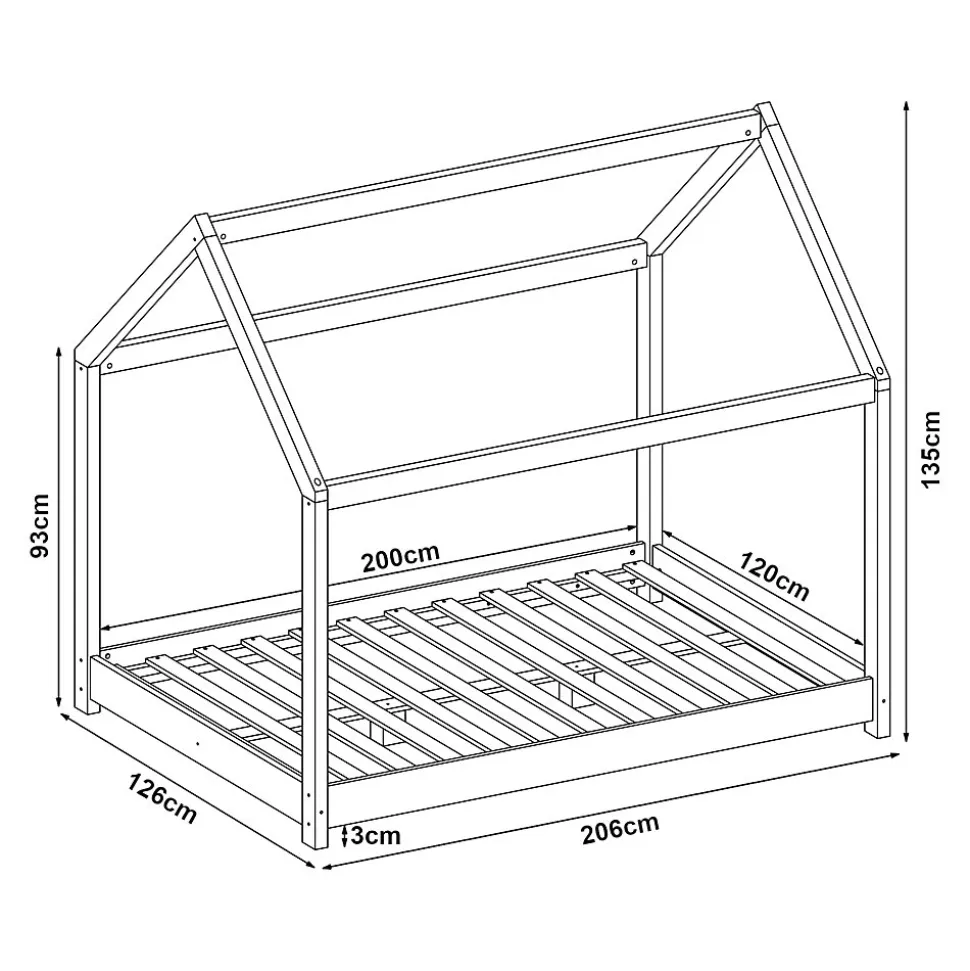 Lit cabane pour enfantCréez un petit paradis accueillant pour dormir et jouer dans la chambre de votre enfant avec notre lit cabane. Son design charmant de maison crée une atmosphère confortable qui invite les petits aventuriers à rêver et à explorer. Polyvalent, ce lit s’harmonise parfaitement avec différents styles d’aménagement, transformant la chambre en une oasis de bien-être personnelle qui complète parfaitement le concept existant.Description :- lit enfant en forme de maison- convient aussi bien aux filles qu’aux garçons- montage facile- capacité de charge : 140 kgDimensions :- totales (longueur x largeur x hauteur) : 206 x 126 x 135 cm- surface de couchage (longueur x largeur) : 200 x 120 cm- distance entre le sol et le bas du toît : 93 cm- hauteur du pied : 3 cmMatière :- cadre : pin- sommier à lattes : contreplaquéCouleur :naturelContenu de la livraison :1 x lit d’enfant1 x sommier à lattes standardA noter :Le matelas, les oreillers, la couverture et les autres objets décoration ne font pas partie de l’offre.Remarque :Pour des raisons logistiques, il n’est malheureusement pas possible de récupérer la marchandise en personne.La livraison s’effectue jusqu’au bord du trottoir ou jusqu’à la porte d’entrée, sans montage.Produit de la marque :[en.casa]