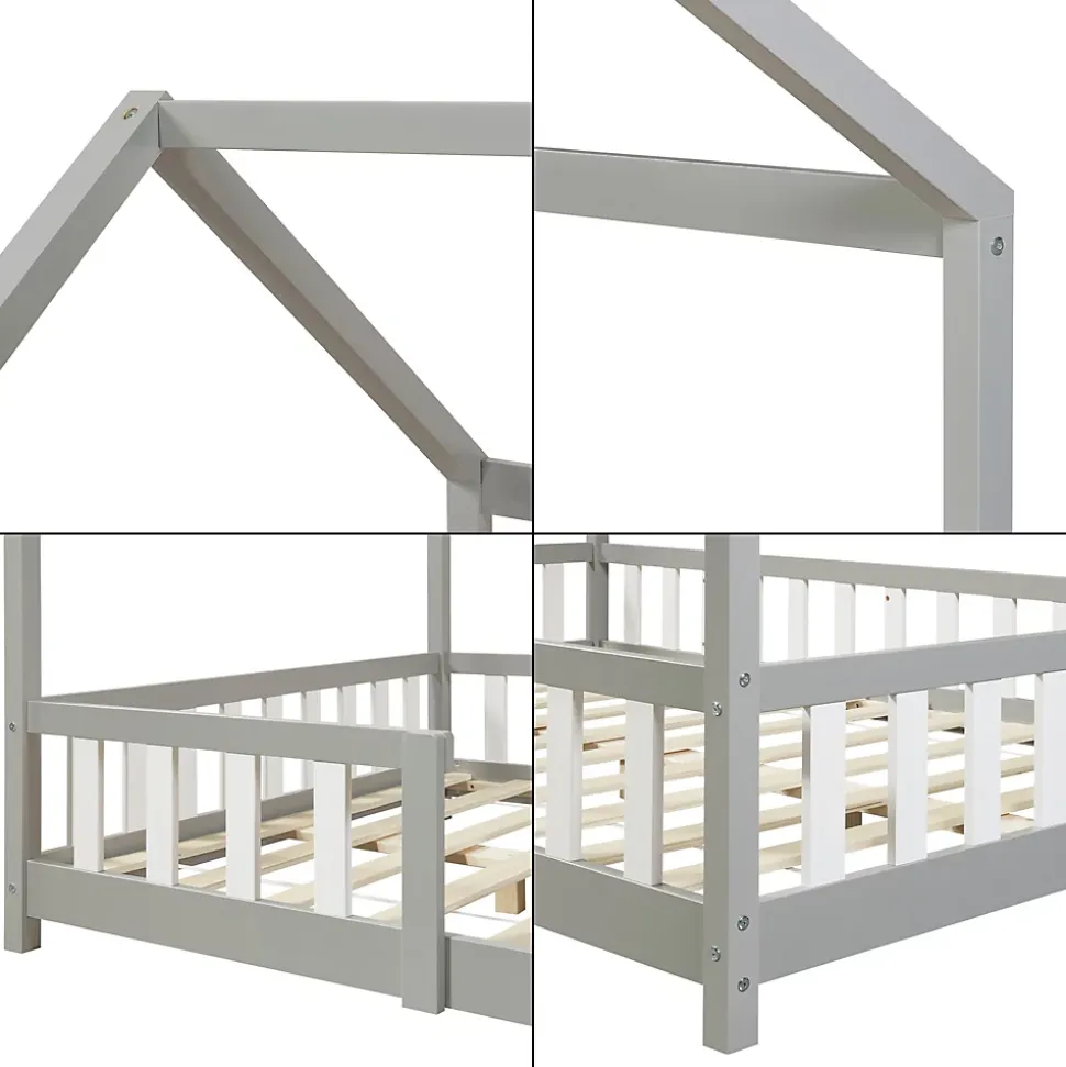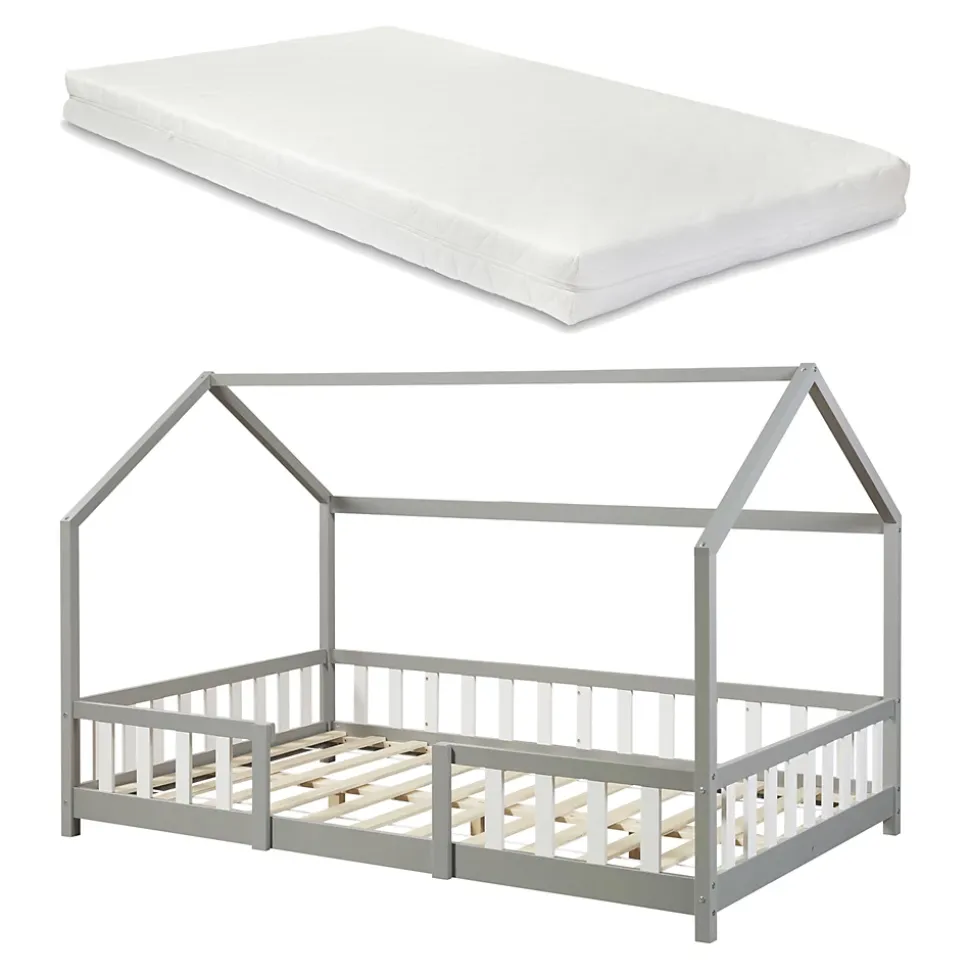 Lit cabane avec matelasOffrez à votre enfant un espace douillet et magique avec ce lit cabane en bois.Points forts :- lit confortable en forme de maison- convient aux filles et aux garçons- la bordure de la clôture sert de protection contre les chutes- montage rapide- capacité de charge jusqu’à 150 kgDimensions (l x l x h) :- totales : 206 x 126 x 135 cm- matelas : 200 x 120 x 16 cm- hauteur du sol au bord du toit : 90 cm- largeur de l’entrée : 50 cm- hauteur de la clôture : 40 cm- hauteur des pieds : 5,5 cmMatière :- cadre de lit : bois de pin- sommier : contreplaquéCouleur :gris clair / blancMatelas en mousse froide- fabriqué en UE- housse matelassée de 1,5 cm en polyester- finition soignée, fines coutures piquées- anti-allergique, respirant, résistant à l’usure- coupé d’une pièce de mousse- grâce à son aération optimale, il est froid en été et chaud en hiver- entretien de la housse : ne la mettez pas à la machine à laver, ne faites pas la blanchir à la javel, ne la repassez pas, ne la nettoyez pas avec des produits chimiquesContenu de la livraison :- 1 x lit d’enfant- 1 x sommier à lattes standard (modèle simple)- 1 x matelasA noter :Pour des raisons logistiques, le retrait sur place n’est pas possible. La livraison se fait jusqu’au trottoir ou à la porte d’entrée, sans montage.Le matelas est expédié séparément, il peut arriver avant ou après le lit.Produits de la marque :[en.casa] et [neu.haus]