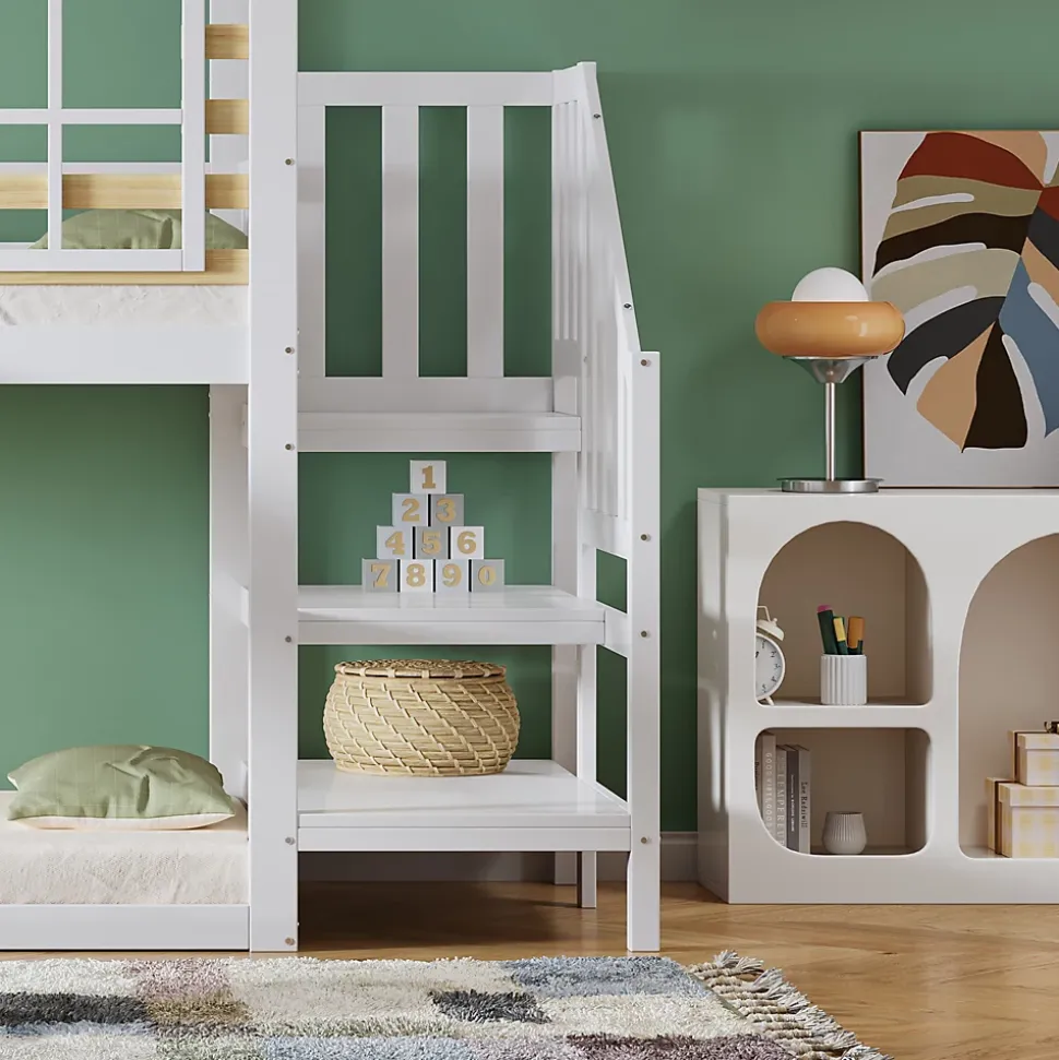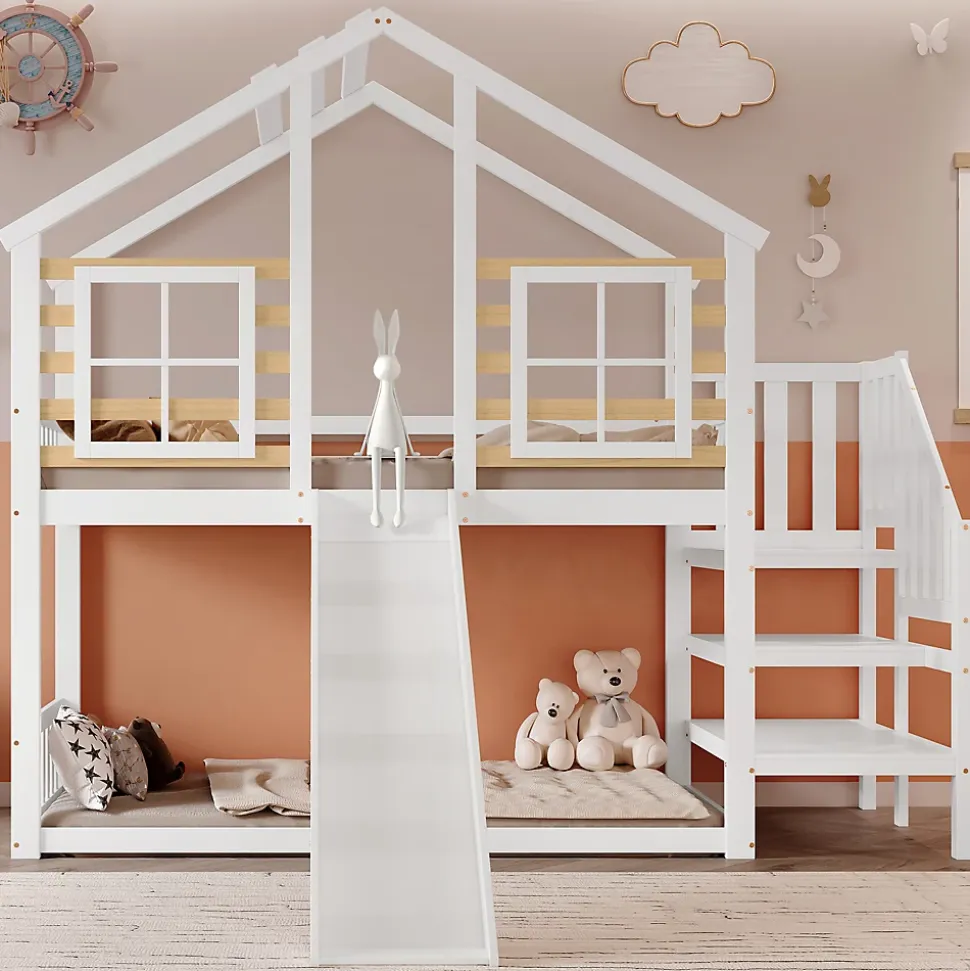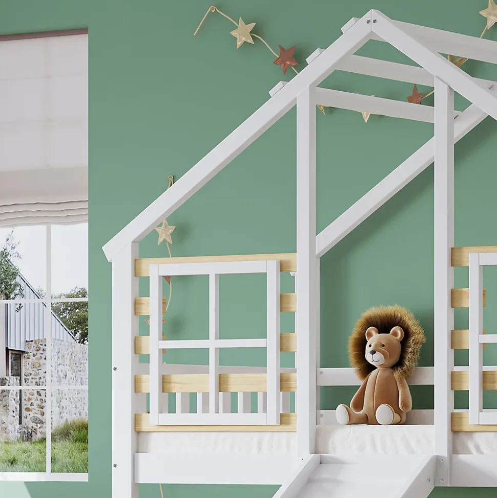Lit superposé avec escalier et barrières, avec toboggan et fenêtres, lit maison avec protection anti-chuteTaille de matelas recommandée pour ce lit superposé : 90×200 cm, épaisseur maximale recommandée 13 cm.Ce lit maison offre un espace de jeu et de sommeil pour les enfants : il est doté d’un toit en forme de coquillage, de deux fenêtres, d’un escalier avec main courante et d’un toboggan. Le lit inférieur est sans cadre, ce qui permet de poser un matelas directement dessus ou d’utiliser l’espace en dessous comme rangement. C’est une excellente option pour toute chambre d’enfant.Dimensions & poidsTaille totale : 254x222x222 cmPoids total : 62,5 kgMatelas recommandé (non inclus) : 90×200 cmCapacité de charge : 120 kgHauteur sous le lit : 91 cmCaractéristiquesNom du produit : Lit superposéCouleur : BlancMatériau du cadre : Bois + MDFMatériau des lattes : BoisMontage : Auto-montageStructure réversible gauche-droite : NonNombre de colis : 3Pays d’origine : ChineRemarque : Ce produit est livré en 3 colis pouvant arriver à des moments différents. Merci de votre patience.