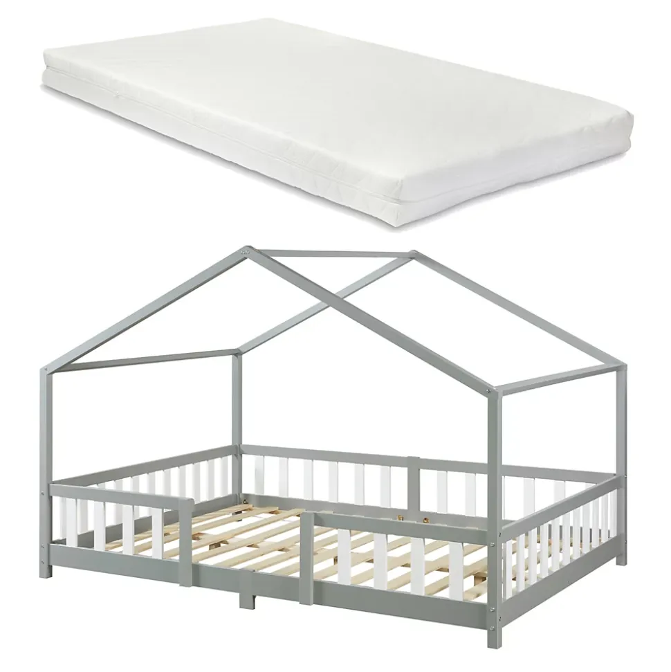 Lit cabaneOffrez à votre enfant un espace douillet et magique avec ce lit cabane en bois.Points forts :- construction solide- montage facile- la grille sert de protection contre les chutes- capacité de charge jusqu’à 120 kgDimensions :- totales (lo x la x h) : 207 x 126 x 138 cm- entrée de lit (h x la) : 15 x 50 cm- hauteur de la grille: 34 cm- distance du sol au bord du toit : 85 cmMatière :- lit: bois de pin- sommier à lattes: contreplaquéCouleur :gris / blanc, laqué matMatelas à mousse à froid (200 x 120 cm)- fabriqué en UE, certifié du label Confiance textile Oeko-Tex Standard 100- housse matelassée de 1,5 cm en polyester- finition soignée, fines coutures piquées- anti-allergique, respirant, résistant à l’usure- coupé d’une pièce de mousse- grâce à son aération optimale, il est froid en été et chaud en hiver- entretien de la housse : ne la mettez pas à la machine à laver, ne faites pas la blanchir à la javel, ne la repassez pas, ne la nettoyez pas avec des produits chimiquesContenu de la livraison :1 x lit d’enfant1 x sommier à lattes1 x matelasA noter :Pour des raisons logistiques, le retrait sur place n’est pas possible. La livraison se fait jusqu’au trottoir ou à la porte d’entrée, sans montage.Le matelas est expédié séparément, il peut arriver avant ou après le lit.Produits de la marque :[en.casa] et [neu.haus]