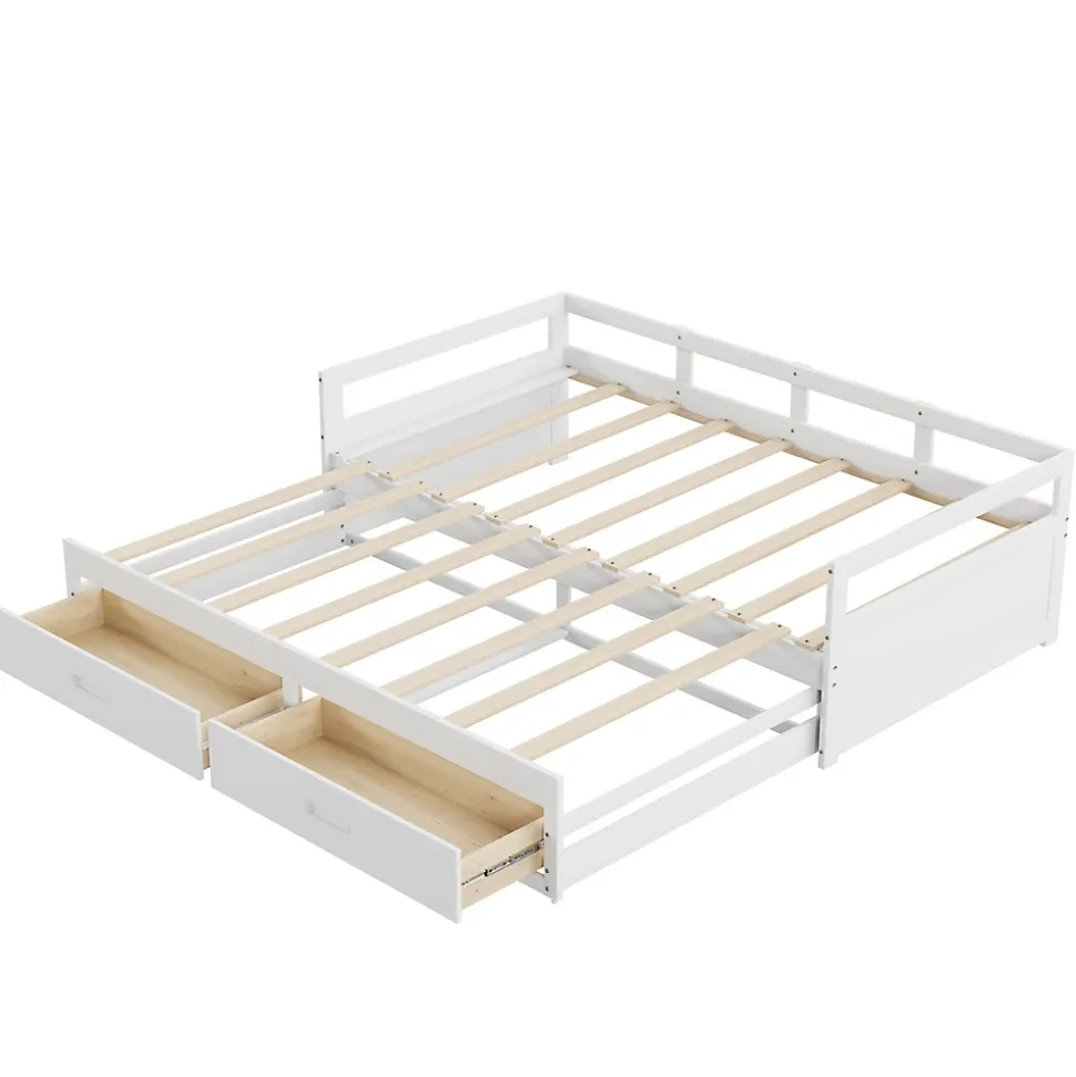 Cadre de lit en pin ce canapé convertible est fabriqué en pin de haute qualité respectueux de l environnement et durable le cadre en bois est bien ventilé et stable pour un sommeil confortableCadre extensible le cadre inférieur comporte un second cadre pouvant être tiré les deux cadres peuvent être assemblés pour obtenir cent quatre vingt par deux cents cm facile à utiliser comme lit simple ou doubleAvec rangement ce cadre en pin est équipé de deux tiroirs dont le fond possède quatre roulettes permettant de nettoyer facilement sous le litDesign à bords droits le design à bords droits économise de l espace et les tiroirs de rangement permettent de garder la pièce organiséeFacile à monter les instructions sont précises et détaillées vous pouvez assembler le lit facilement votre satisfaction est notre priorité pour toute question contactez nous