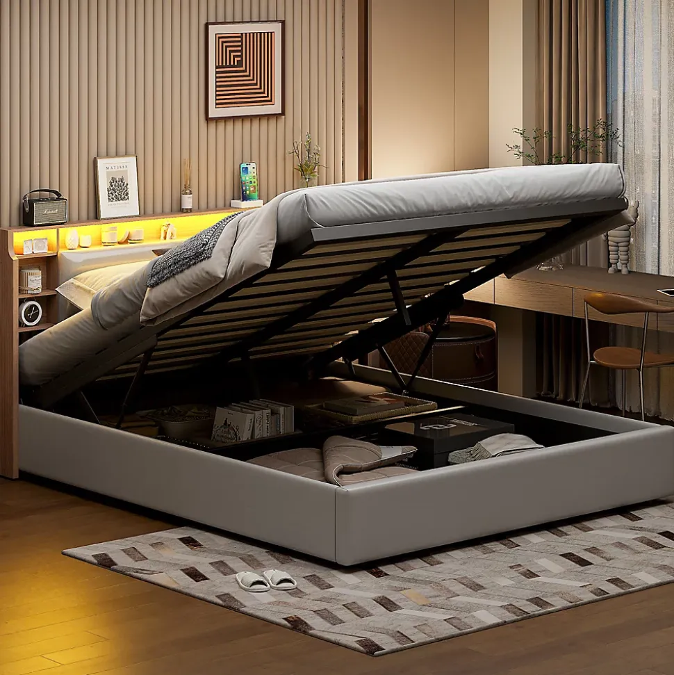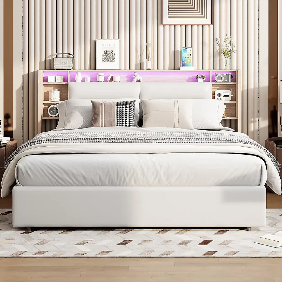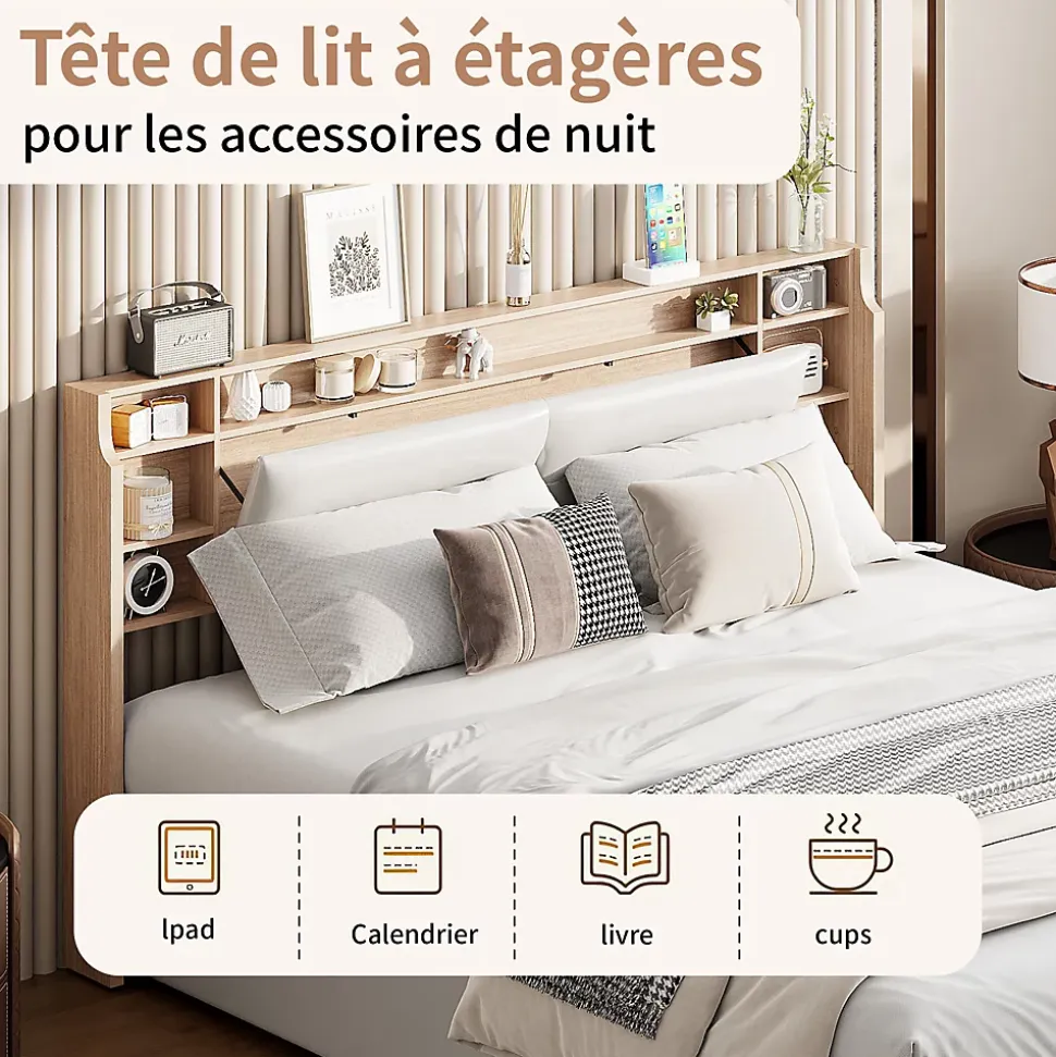 Éclairage LED : la tête et le pied de lit sont équipés de bandes lumineuses LED colorées. Vous pouvez facilement contrôler les couleurs et les motifs via la télécommande et ainsi ajouter du plaisir et de la beauté à votre chambre à coucher.Équipé de ports USB et de type C : la tête de lit pratique est équipée de ports de charge USB et de type C, ce qui vous permet de charger facilement votre téléphone et votre tablette avant de vous coucher sans avoir à vous lever pour trouver une prise de courant.Confort maximal : la tête de lit rembourrée est remplie d’éponge haute densité et recouverte de tissu de lin, qui non seulement a une bonne élasticité, mais vous offre également une sensation de couchage confortable.Solution de rangement bien pensée : sous le lit à ressorts de 160 x 200 cm, il y a 4 grands tiroirs qui vous offrent un espace de rangement spacieux, parfait pour ranger les couettes, les oreillers ou les vêtements. Le fond du tiroir est équipé de roues pour faciliter le mouvement et économiser du travail.Stabilité structurelle : le cadre principal en acier robuste assure la stabilité. Le sommier à lattes est composé de lattes en bois massif durables et vous offre un soutien confortable pour un sommeil réparateur. Veuillez noter que le lit rembourré de 160 x 200 cm est expédié en deux paquets pour des raisons de sécurité et peut arriver à différentes dates.