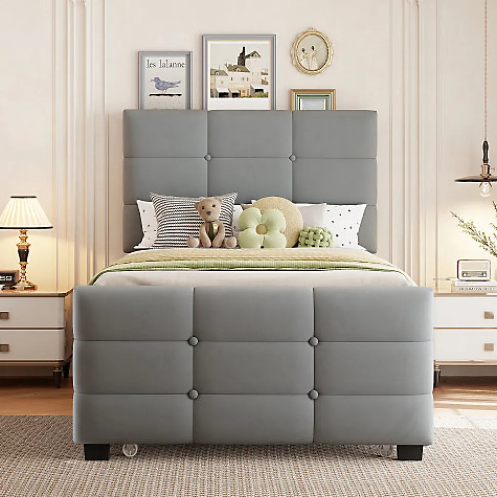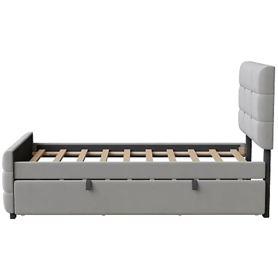 •【Design minimaliste classique】Ce lit enfant est doté d’une tête de lit rembourrée en mousse et d’un motif à rayures verticales classiques, lui conférant une allure simple et élégante qui s’harmonise parfaitement avec différents styles de chambre.•【Lit gigogne】Ce lit capitonné s’adapte facilement à vos besoins d’espace. En plus du lit principal (90 x 190 cm), un lit gigogne de 190 x 90 cm se trouve en dessous et peut être utilisé comme lit d’appoint.•【Tissu velours】Ce lit capitonné est confectionné en velours de haute qualité, un tissu délicat, doux au toucher, agréable pour la peau et respirant, pour un confort optimal. Le lit est disponible en beige et en gris.•【Robuste et stable】Ce lit enfant est doté d’une structure en bois et d’un sommier capitonné à lattes, supportant un poids maximal de 150 kg. De plus, ses pieds courts assurent une stabilité parfaite.•【Facile à assembler】Des instructions détaillées et des pièces complètes sont disponibles pour vous aider à réaliser l’assemblage rapidement.