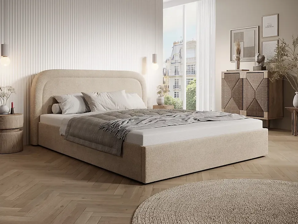 Avec son tissu tout doux et son design aux courbes arrondies, le lit FIREZA viendra créer un réel cocon dans votre chambre. Son petit plus, ce lit est équipé d’un coffre avec une grande capacité de rangement, idéal pour gagner de la place dans votre pièce ! 1 x Cadre de lit FIREZACaractéristiques Couleur (nuance) : Beige Matière (précision) : 100 % Polyester Structure : Bois, Panneau de particules Finition : Chiné Taille (couchage) : 140 x 190 cm Nombre de places : 2 places Garnissage : Mousse polyuréthane Densité (garnissage) : 25 kg/m³ Sans matelas Gamme : Made for design, Good for Planet, Création Exclusive Produit : Fabriqué en Europe Charge maximale supportée : 250 kg À monter soi-même : Ce lit est compatible avec tous les matelas 140×190 cmDimensions Longueur : 152 cm Hauteur : 90 cm Profondeur : 212 cm Hauteur de couchage : 31 cm Tête de lit : L152xP11xH90cm1 x Cadre à lattes ALANECaractéristiques Couleur (nuance) : Blanc Matière (précision) : Métal Epaisseur métal : 2 mm Taille (couchage) : 140 x 190 cm Nombre de places : 2 places Sans pieds Technologie (sommier) : Lattes actives Nombre de lattes : 32 lattes Matière des lattes : Bois (bouleau) Sens d’ouverture : Ouverture Verticale Gamme : Good for Planet Produit : Fabriqué en Europe Charge maximale supportée : 250 kg À monter soi-même : Corde permettant de lever facilement le sommierDimensions Longueur : 190 cm Hauteur : 8 cm Profondeur : 139 cm1 x Sommier coffre LOKIACaractéristiques Couleur (nuance) : Blanc Matière (précision) : HDF Taille (couchage) : 140 x 190 cm Nombre de places : 2 places Avec pieds, Sans pieds Gamme : Good for Planet Produit : Fabriqué en Europe Livré montéDimensions Longueur : 190 cm Hauteur : 0.5 cm Profondeur : 140 cmLivraisonLors de la livraison, il est conseillé de vérifier que le bon nombre de colis a été livré.Colis1 x Cadre de lit FIREZAColis n°1 : Longueur 154 cm, Largeur 87 cm, Hauteur 12 cm, Poids 26 kg. Colis n°2 :