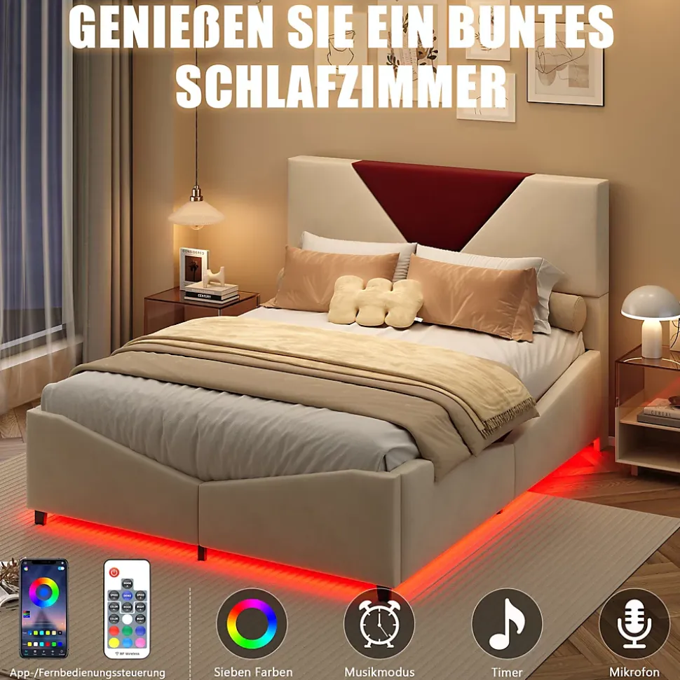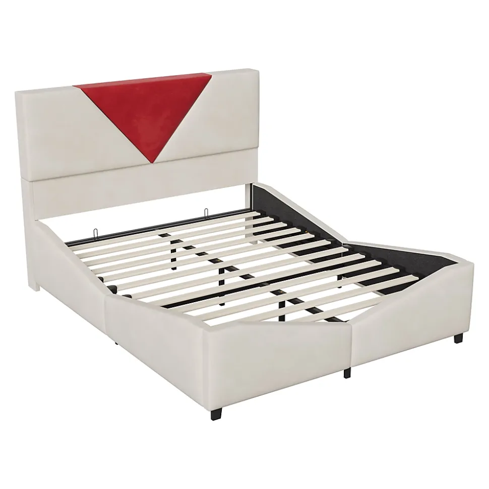 1. Grand espace de rangement, fini le désordre : Le lit dispose d’un espace de rangement à ouverture assistée par gaz, idéal pour ranger couvertures, vêtements ou articles saisonniers. Optimisez l’espace de votre chambre et maintenez-la ordonnée, même dans un petit appartement.2. Tête de lit bicolore, design élégant : La tête de lit présente un motif triangulaire en blanc cassé et rouge bordeaux, apportant une touche artistique et moderne à votre chambre. Elle s’adapte facilement aux styles contemporains ou luxe discret et devient le point focal visuel de la pièce.3. Structure de lit solide, grande capacité de charge : Fabriqué en bois de qualité et métal, avec un sommier à lattes scientifiquement conçu pour un soutien uniforme et robuste. Garantit stabilité et durabilité pour un sommeil en toute sérénité.4. Dossier rembourré confortable, soutien agréable : Les parties rembourrées de la tête et du corps du lit offrent une sensation douce et un bon soutien du dos, pour un confort optimal lors du repos ou de la lecture.5. Design de rangement pratique, accès facile : L’espace de rangement est conçu pour une ouverture aisée, permettant de prendre vos affaires sans effort. Organiser votre chambre devient simple et rapide.&Détails du produit&Taille : 140 x 190 cmCouleur : Blanc casséMatériau du produit : métal + MDFMatelas inclus : NonDimensions totales du produit : 207 x 149 x 125cmNombre de paquets : 2Capacité de poids : 500 kgNombre de lamelles : 12&Remarques&※ En raison de la mesure manuelle, un écart de 2 à 3 cm peut se produire.※ En raison de l’influence de la lumière du soleil et d’autres facteurs, il peut y avoir de légères différences de couleur.※ Ce produit sera expédié en 2 colis. Ils peuvent arriver à des moments différents. Veuillez patienter.