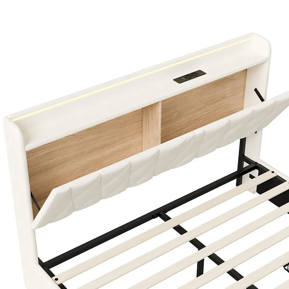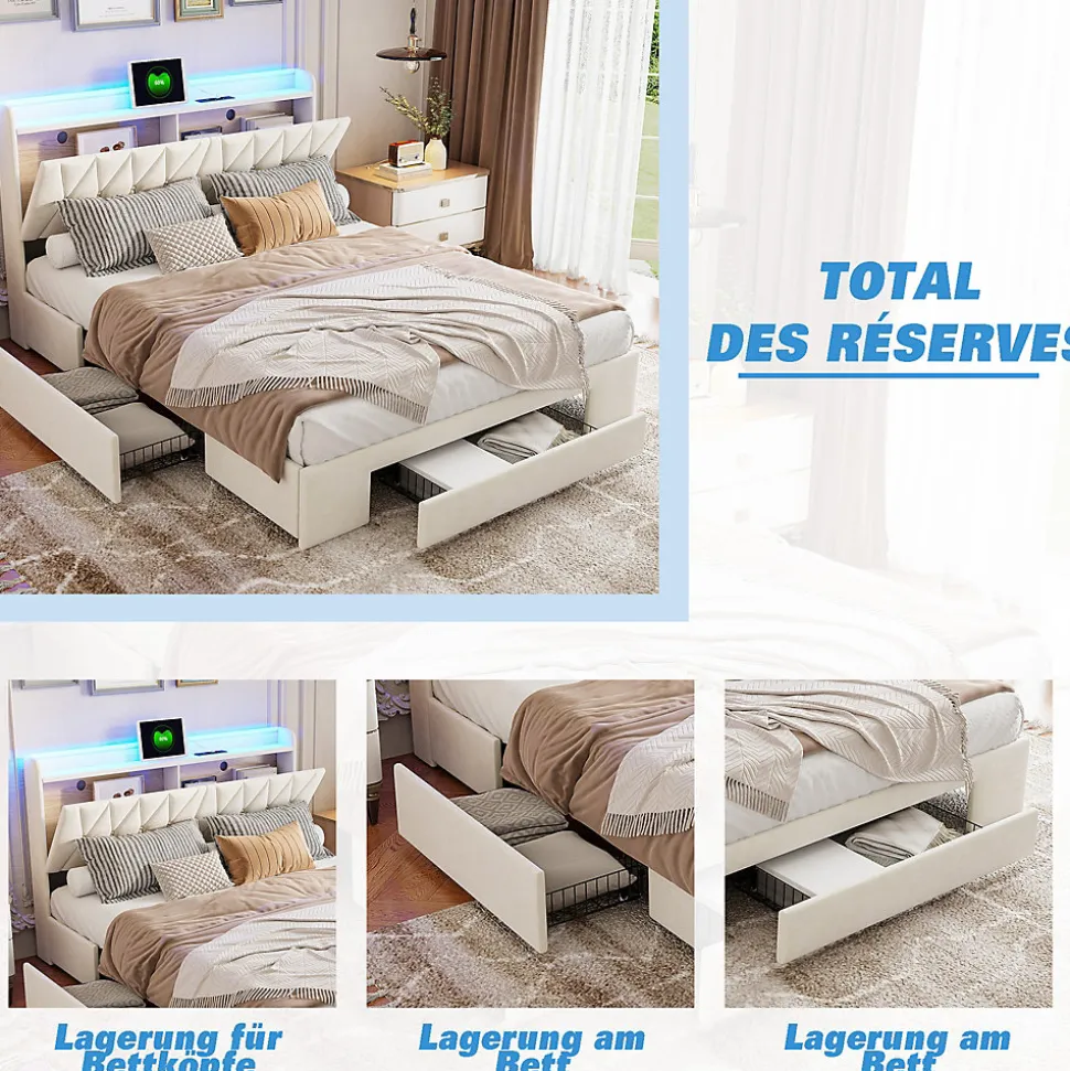 Design moderne et chaleureux Revêtu dun tissu teddy beige doux et moelleux, ce lit double allie élégance et confort. Sa texture agréable au toucher crée une atmosphère cosy et raffinée, idéale pour transformer votre chambre en un espace de détente. Grand espace de rangementSitués au pied du lit, les tiroirs intégrés offrent une capacité de rangement généreuse. Parfaits pour organiser votre linge de lit, vos oreillers, vos vêtements ou dautres objets du quotidien, ils permettent de garder votre chambre propre et bien ordonnée. Ports USB intégrésLa tête de lit est équipée de ports USB pratiques, vous permettant de recharger facilement vos téléphones, tablettes ou autres appareils électroniques. Fini les câbles encombrants ou les multiprises éloignées, tout est à portée de main. Confort et robustesseLa structure du lit associe bois et métal de haute qualité, assurant une stabilité optimale et une longue durée de vie. Le sommier est conçu pour offrir un bon soutien, garantissant des nuits paisibles et confortables. Polyvalent et facile à intégrerGrâce à son design épuré et sa couleur neutre, ce lit sharmonise facilement avec tous les styles de décoration : moderne, scandinave, minimaliste ou contemporain. Il constitue un choix idéal pour les chambres principales comme pour les chambres damis. Détails : Dimensions : 207 x 145 x 108cm, Matelas compatible : 140 x 190 cm (matelas non inclus). Ce lit sera expédié par lots. En raison de contraintes logistiques, il est possible que les livraisons ne soient pas simultanées. Merci de votre patience.