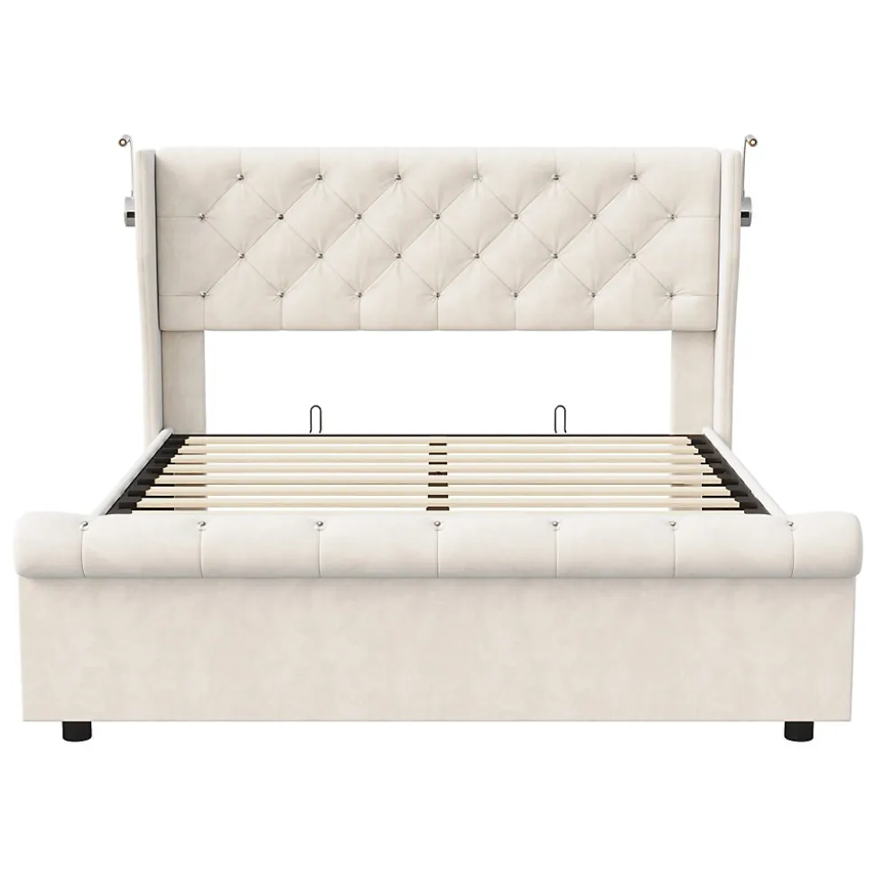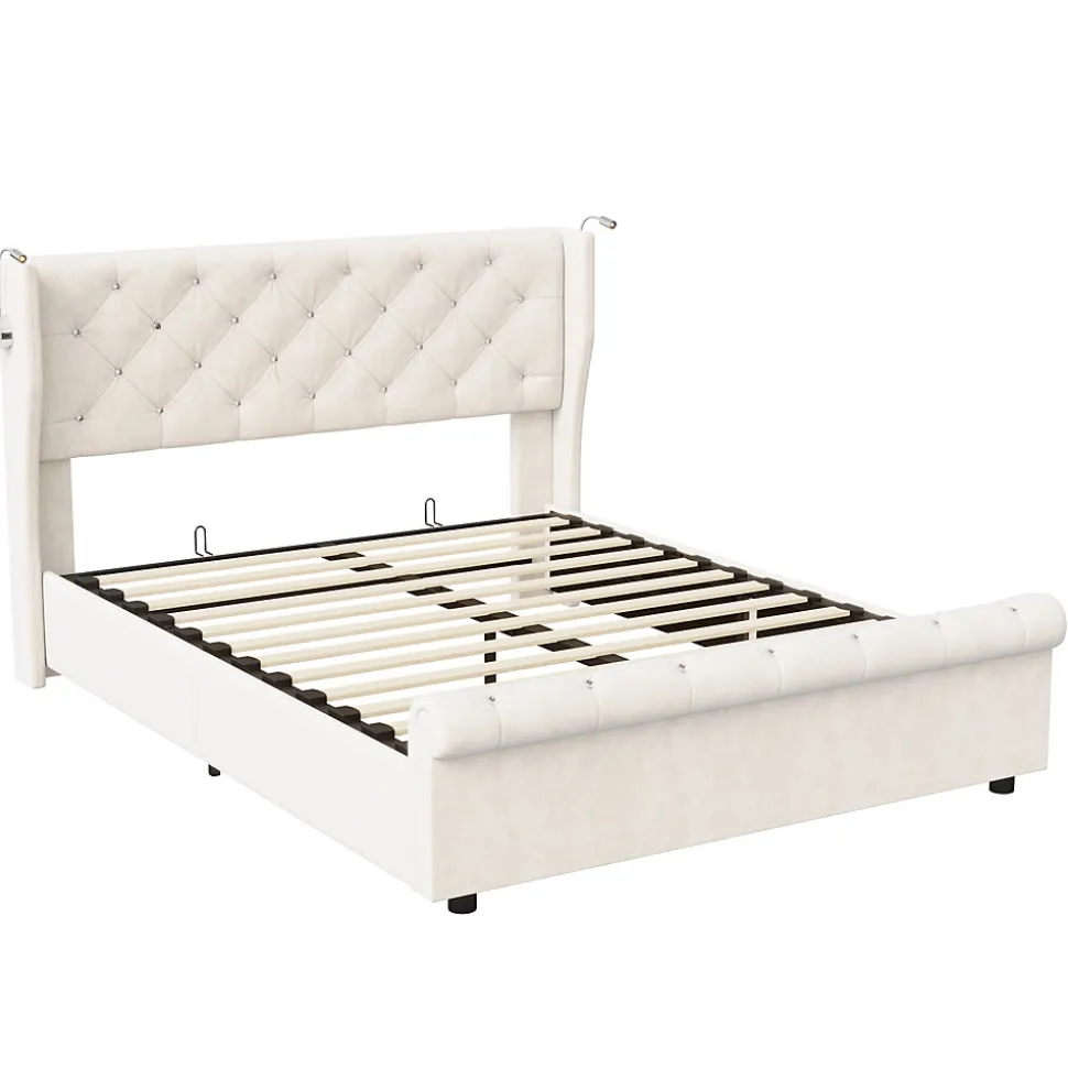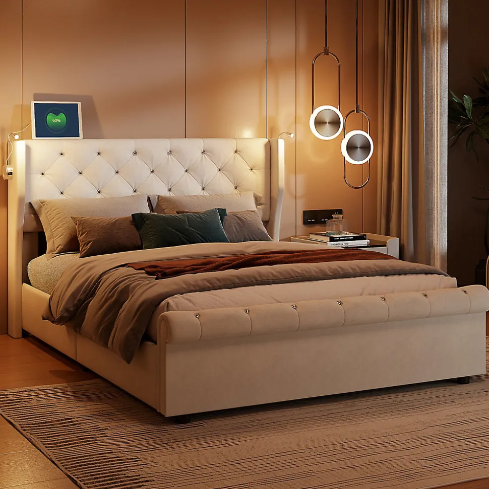 Description Tête de lit avec liseuse :Cette tête de lit est intelligemment conçue avec juste ce qu’il faut de lumière, de chaleur et de douceur pour vous permettre de vous immerger dans un océan de mots sans déranger votre partenaire. La direction de la lumière peut être facilement ajustée, vous permettant d’éclairer la cible de lecture comme vous le souhaitez, rendant l’expérience de lecture plus parfaite. Fonction de charge intégrée :Vous n’avez plus besoin de vous lever parce que les téléphones portables, tablettes et autres appareils électroniques sont déchargés. Vous pouvez charger vos appareils dans une position de chevet confortable avec une seule prise, économisant du temps et des efforts et vous rendant la vie plus pratique. Durable:Des matériaux soigneusement sélectionnés garantissent la durabilité de cette tête de lit. Le cadre principal est fabriqué en fer solide avec une capacité de charge allant jusqu’à 300 kg, vous offrant un environnement de sommeil stable. La base est constituée de lattes élastiques en bois massif pour offrir un soutien confortable à votre corps, vous permettant de profiter de la meilleure expérience de sommeil. Conception sophistiquée :En plus de la fonctionnalité et de la durabilité, cette tête de lit est également conçue avec un espace de rangement généreux. La grande boîte de lit sous la planche de lit pliante peut facilement contenir des couvertures, des oreillers, des draps et d’autres articles pour garder votre chambre bien rangée. Le tissu Oxford recouvert au bas du lit peut empêcher efficacement l’intrusion de la poussière et garder votre lit propre.Spécification: Dimensions hors tout : 202x148x109 cm Surface de couchage : 140×190 cm (sans matelas)