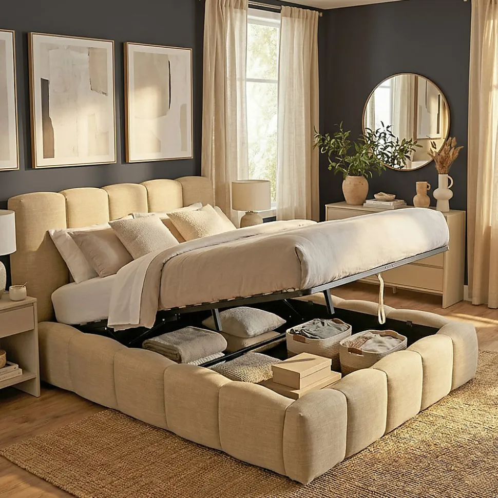 Lit coffre 140x190cm NEST + 1 sommier. Redéfinissez le confort et l’esthétique de votre chambre avec le lit NEST. Véritable pièce maîtresse, ce lit se distingue par son allure sculpturale et ses lignes généreuses qui invitent à la détente et au cocooning.Le lit NEST se démarque par son cadre de lit et sa tête de lit matelassés, composés de sections bombées qui créent un effet visuel de douceur et de volume. Ce revêtement texturé, aux finitions soignées, apporte une touche contemporaine et chaleureuse à votre intérieur, s’adaptant aussi bien aux décors minimalistes qu’aux ambiances plus feutrées.Ne choisissez plus entre style et praticité. Sous son sommier à lattes, le lit NEST cache un vaste coffre de rangement. Idéal pour optimiser l’espace, il vous permet de stocker couettes, oreillers et linge de maison en toute discrétion, tout en les gardant à portée de main.Les Plus Produits : – Confort visuel et tactile : Une structure entièrement capitonnée pour un rendu « nuage » ultra-tendance.- Mécanisme performant : Système d’ouverture par vérins pour une manipulation fluide et sans effort.- Qualité de couchage : Sommier à lattes robustes inclus, garantissant un excellent maintien de votre matelas.- Gain de place : Un espace de stockage spacieux sur toute la surface du lit.Caractéristiques techniques : – Dimension couchage : 140×190 cm.- Revêtement : Tissu texturé en lin (coloris beige naturel).- Structure : Bois et métal.- Sommier : Relevable, cadre métallique et lattes en multiplis.- Pieds plastique.- Dimensions hors tout (LxPxH) : 222x171x114cm. – Dimensions coffre (LxPxH) : 194x141x25cm – 683 litres.- Poids maximum du matelas conseillé : 30 kg.Livré démonté, sans accessoires. A monter soi-même. Dimensions:222x171x114
