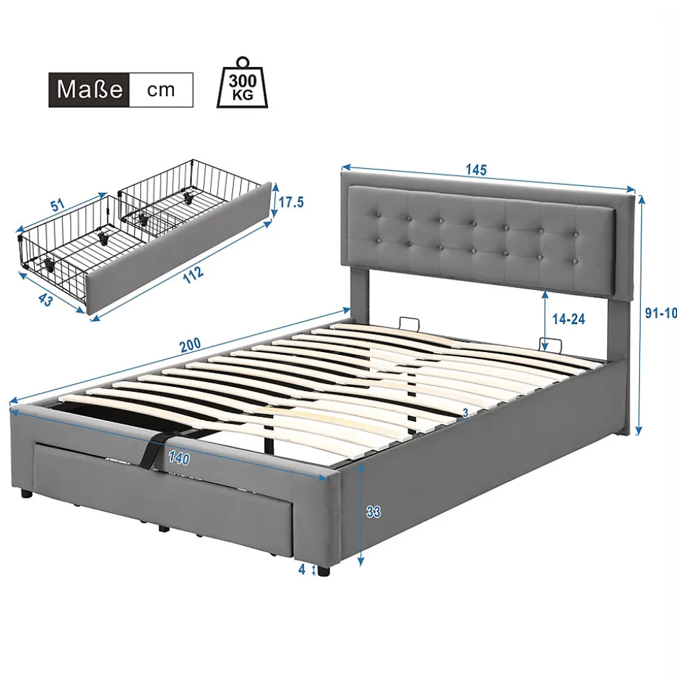 ▶ ▶ Détails ▶────────────────● Dimensions totales : 200 × 145 × 101 cm● Surface de couchage : 140 × 200 cm (Sans matelas)● Couleur : Gris● Matériau : Bois + Velours + Métal● Capacité de charge maximale : 300 kg● Nombre de colis : 2► Remarques ►※ Ce produit est expédié en 2 colis, qui peuvent arriver séparément. Merci de patienter.※ Une marge d’erreur de 2 à 3 cm peut survenir en raison des mesures manuelles.※ En raison de l’éclairage, il peut exister des différences de couleur entre les images du produit et le produit réel. Veuillez vous référer à l’article réellement reçu.※ Si vous avez des questions lors de l’installation, veuillez nous contacter dès que possible.
